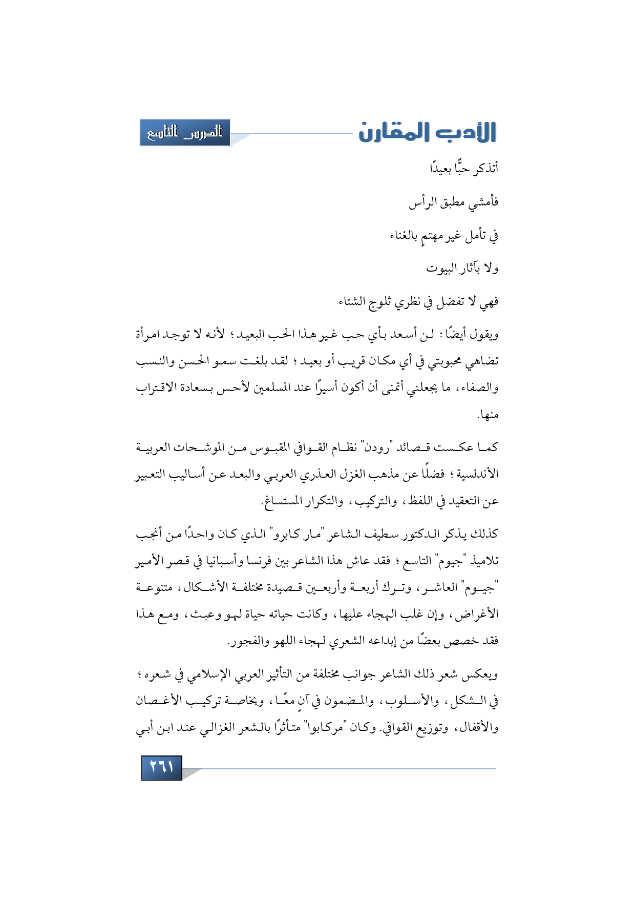 ويقول أيضًا: لن أسعد بأي حب غير هذا الحب البعيد؛ لأنه لا توجد امرأة تضاهي محبوبتي في أي مكان قريب أو بعيد؛ لقد بلغت سمو الحسن والنسب والصفاء، ما يجعلني أتمنى أن أكون أسيرًا عند المسلمين لأحس بسعادة الاقتراب منها.