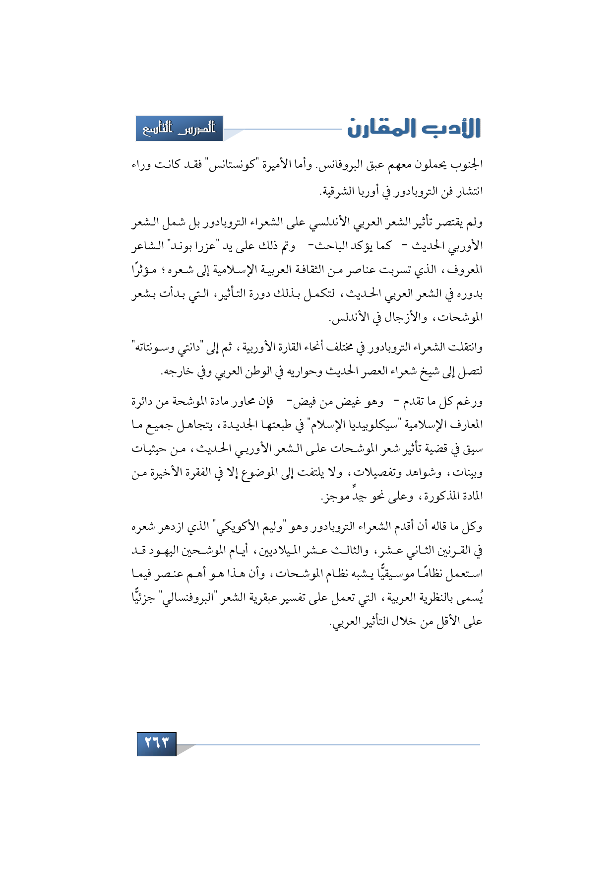 وكل ما قاله أن أقدم الشعراء التروبادور وهو وليم الأكويكي الذي ازدهر شعره في القرنين الثاني عشر، والثالث عشر الميلاديين، أيام الموشاحين اليهود قد استعمل نظامًا موسيقيًّا يشبه نظام الموشحات، وأن هذا هو أهم عنصر فيما يُسمى بالنظرية العربية، التي تعمل على تفسير عبقرية الشعر "البروفنسالي" جزئيًّا على الأقل من خلال التأثير العربي.
