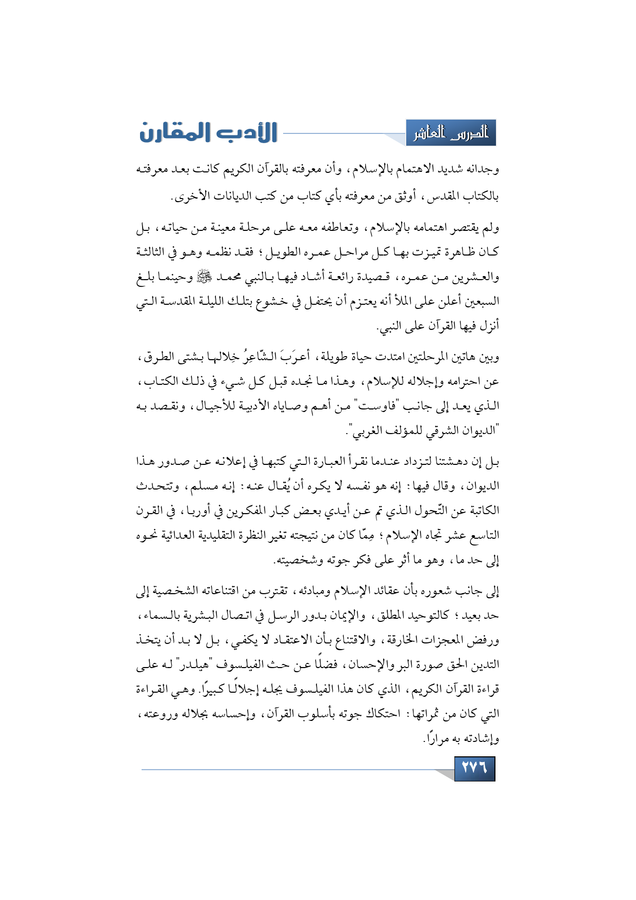 وبين هاتين المرحلتين امتدت حياة طويلة، أعرَبَ الشّاعِرُ خِلالها بشتى الطرق، عن احترامه وإجلاله للإسلام، وهذا ما نجده قبل كل شيء في ذلك الكتاب، الذي يعد إلى جانب "فاوست" من أهم وصاياه الأدبية للأجيال، ونقصد به "الديوان الشرقي للمؤلف الغربي".