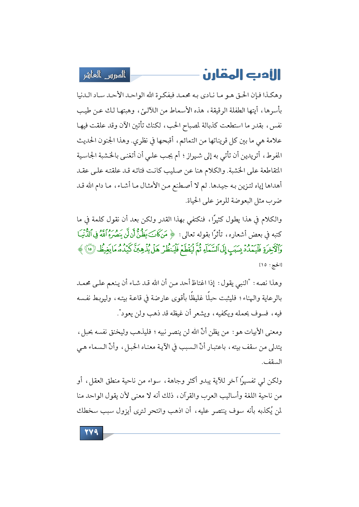 والكلام في هذا يطول كثيرًا، فنكتفي بهذا القدر ولكن بعد أن نقول كلمة في ما كتبه في بعض أشعاره، تأثرًا بقوله تعالى: {مَنْ كَانَ يَظُنُّ أَنْ لَنْ يَنْصُرَهُ اللَّهُ فِي الدُّنْيَا وَالْآخِرَةِ فَلْيَمْدُدْ بِسَبَبٍ إِلَى السَّمَاءِ ثُمَّ لِيَقْطَعْ فَلْيَنْظُرْ هَلْ يُذْهِبَنَّ كَيْدُهُ مَا يَغِيظُ} (الحج: 15)