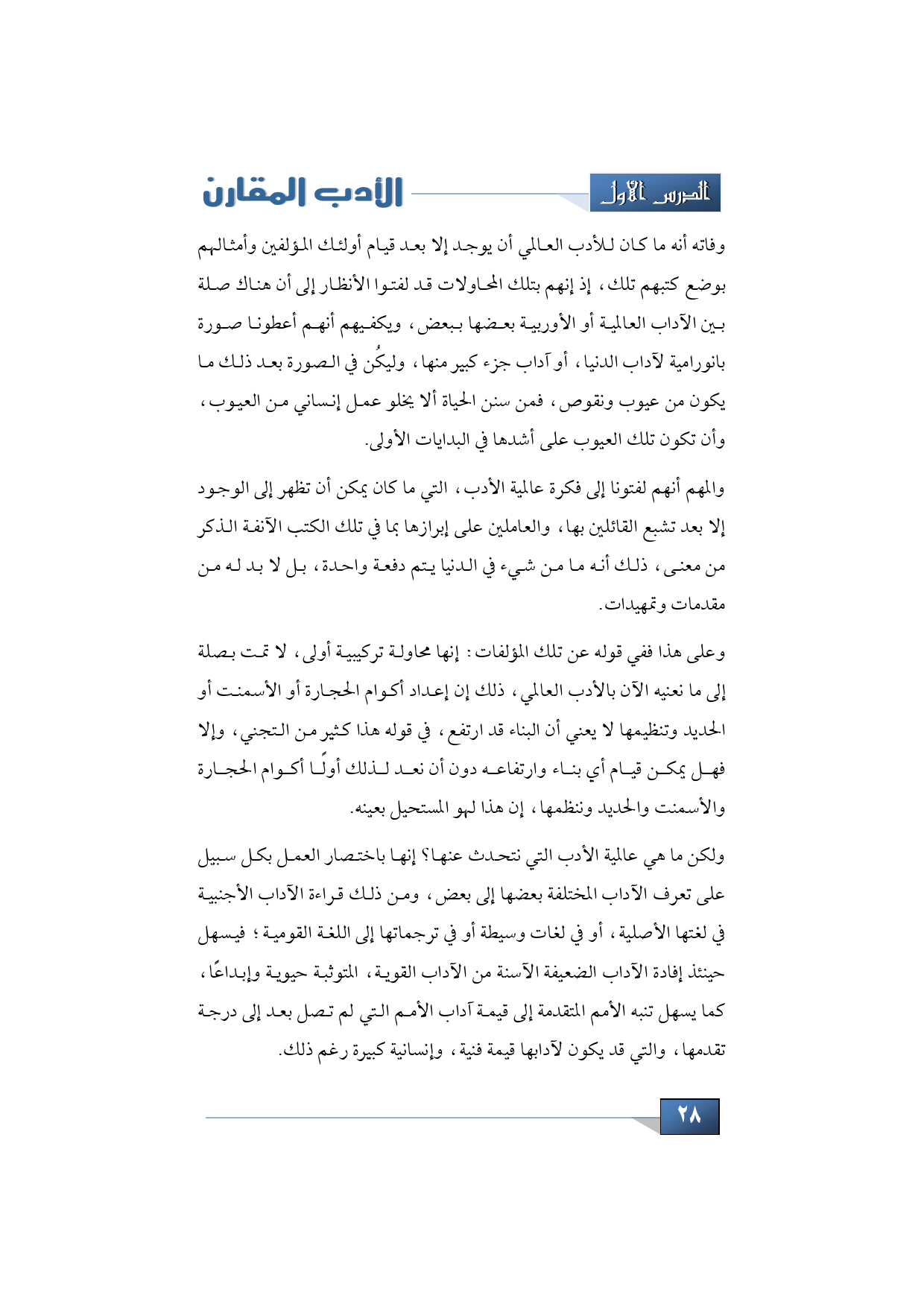 ولكن ما هي عالمية الأدب التي نتحدث عنها؟ إنها باختصار العمل بكل سبيل على تعرف الآداب المختلفة بعضها إلى بعض، ومن ذلك قراءة الآداب الأجنبية في لغتها الأصلية، أو في لغات وسيطة أو في ترجماتها إلى اللغة القومية؛ فيسهل حينئذ إفادة الآداب الضعيفة الآسنة من الآداب القوية المتوثبة حيوية وإبداعًا، كما يسهل تنبه الأمم المتقدمة إلى قيمة آداب الأمم التي لم تصل بعد إلى درجة تقدمها، والتي قد يكون لآدابها قيمة فنية، وإنسانية كبيرة رغم ذلك.