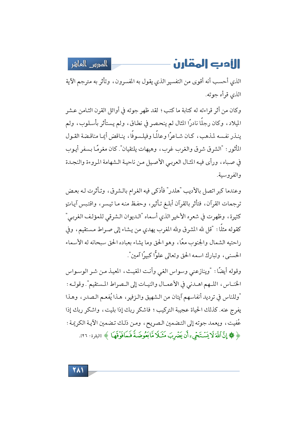 وقوله أيضًا: "وينازعني وسواس الغي وأنت المغيث، المعيذ من شر الوسواس الخناس، اللهم اهدني في الأعمال والنيات إلى الصراط المستقيم". وقوله: "وللناس في ترديد أنفاسهم آيتان من الشهيق والزفير، هذا يُفعم الصدر، وهذا يفرج عنه. كذلك الحياة عجيبة التركيب؛ فاشكر ربك إذا بليت، واشكر ربك إذا عُفيت، ويعمد جوته إلى التضمين الصريح، ومن ذلك تضمين الآية الكريمة: {إِنَّ اللَّهَ لَا يَسْتَحْيِي أَنْ يَضْرِبَ مَثَلًا مَا بَعُوضَةً فَمَا فَوْقَهَا} (البقرة: 26).