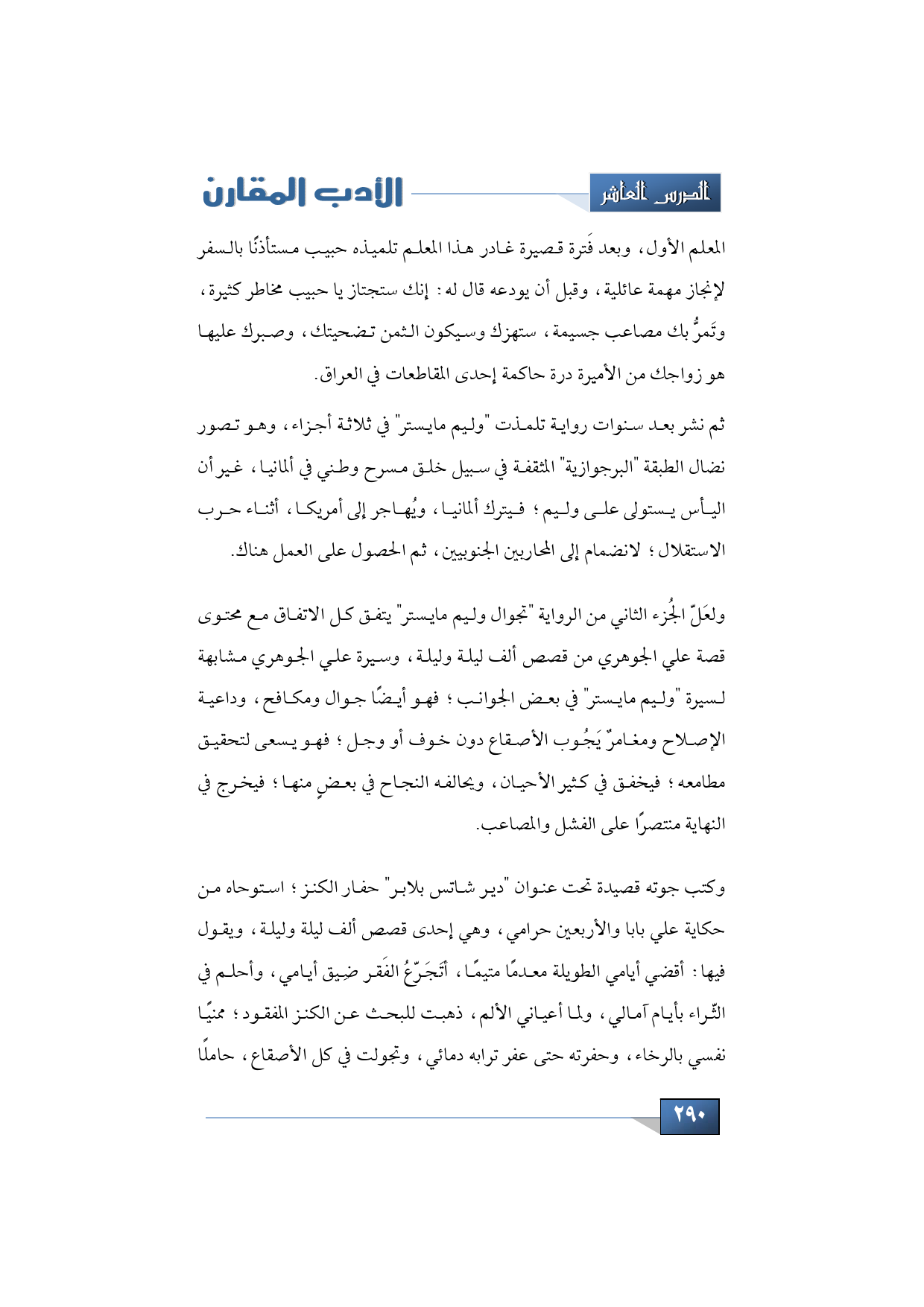 ولعَلّ الجُزء الثاني من الرواية "تجوال وليم مايستر" يتفق كل الاتفاق مع محتوى قصة علي الجوهري من قصص ألف ليلة وليلة، وسيرة علي الجوهري مشابهة لسيرة "وليم مايستر" في بعض الجوانب؛ فهو أيضًا جوال ومكافح، وداعية الإصلاح ومغامرٌ يَجُوب الأصقاع دون خوف أو وجل؛ فهو يسعى لتحقيق مطامعه؛ فيخفق في كثير الأحيان، ويحالفه النجاح في بعضٍ منها؛ فيخرج في النهاية منتصرًا على الفشل والمصاعب.