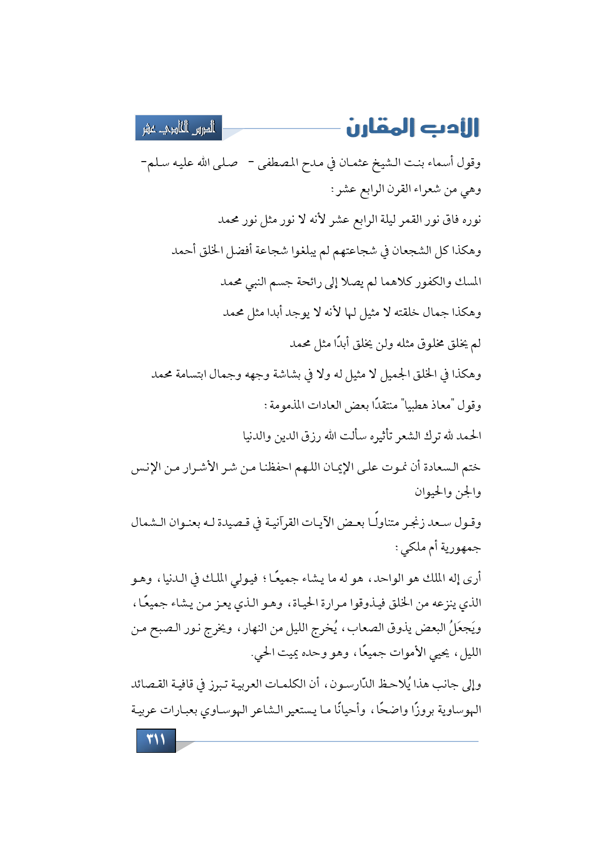 وقول أسماء بنت الشيخ عثمان في مدح المصطفى -صلى الله عليه سلم- وهي من شعراء القرن الرابع عشر: