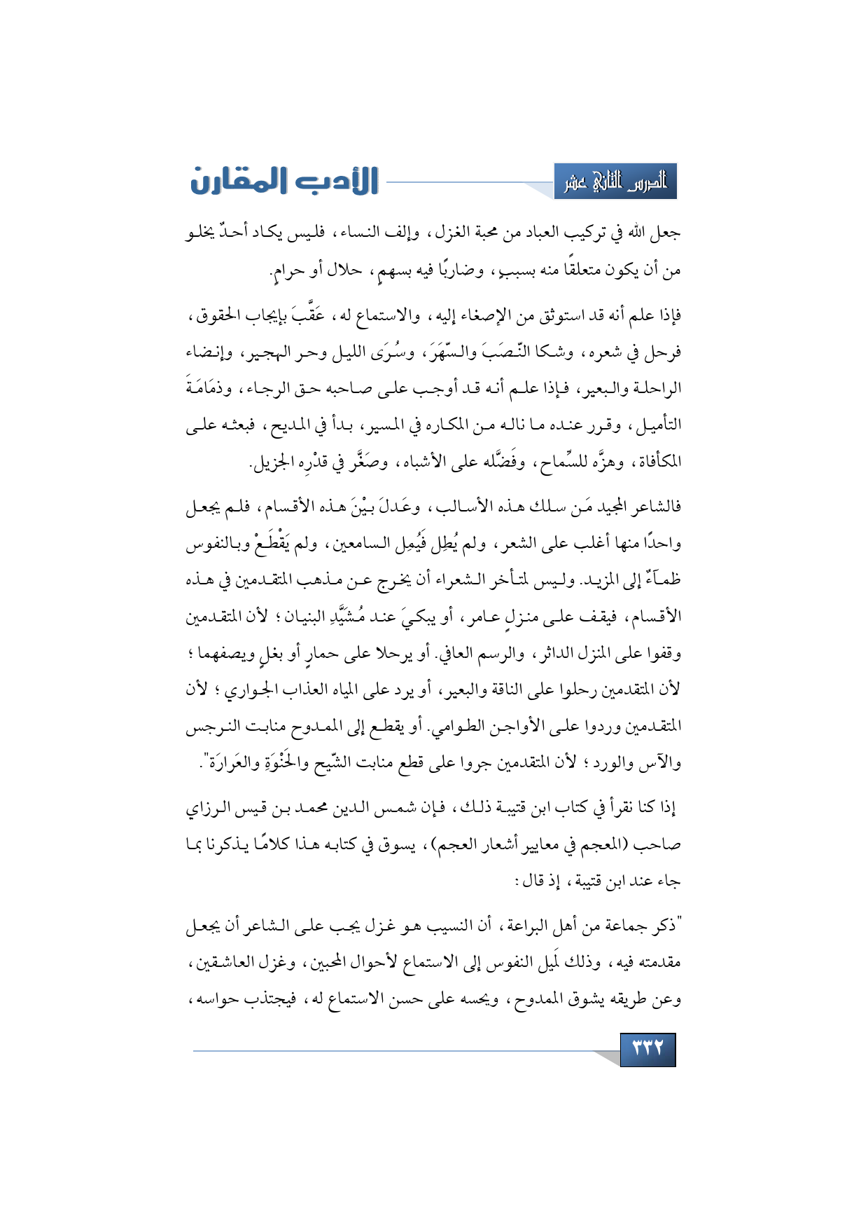 فالشاعر المجيد مَن سلك هذه الأسالب، وعَدلَ بيْنَ هذه الأقسام، فلم يجعل واحدًا منها أغلب على الشعر، ولم يُطِل فَيُمِل السامعين، ولم يَقْطَعْ وبالنفوس ظمآءٌ إلى المزيد. وليس لمتأخر الشعراء أن يخرج عن مذهب المتقدمين في هذه الأقسام، فيقف على منزلٍ عامر، أو يبكيَ عند مُشَيَّدِ البنيان؛ لأن المتقدمين وقفوا على المنزل الداثر، والرسم العافي. أو يرحلا على حمارٍ أو بغلٍ ويصفهما؛ لأن المتقدمين رحلوا على الناقة والبعير، أو يرد على المياه العذاب الجواري؛ لأن المتقدمين وردوا على الأواجن الطوامي. أو يقطع إلى الممدوح منابت النرجس والآس والورد؛ لأن المتقدمين جروا على قطع منابت الشّيح والحَنْوَةِ والعَرارَة ".