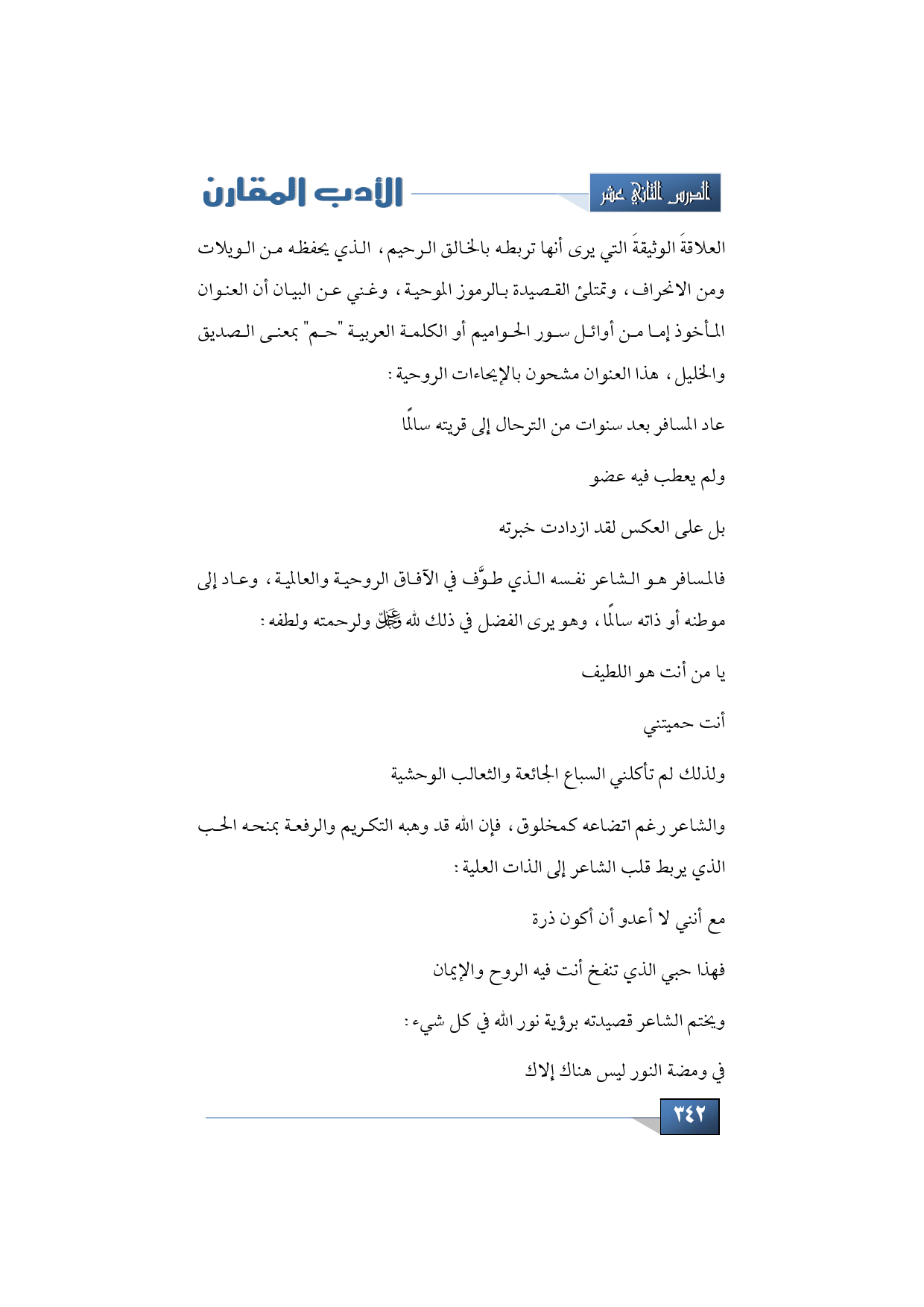 فالمسافر هو الشاعر نفسه الذي طوَّف في الآفاق الروحية والعالمية، وعاد إلى موطنه أو ذاته سالمًا، وهو يرى الفضل في ذلك لله -عز وجل- ولرحمته ولطفه: