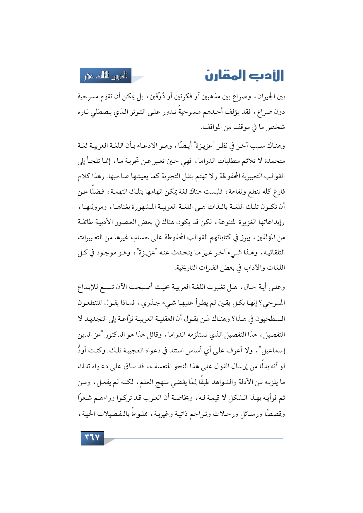 وهناك سبب آخر في نظر "عزيزة" أيضًا، وهو الادعاء بأن اللغة العربية لغة متجمدة لا تلائم متطلبات الدراما، فهي حين تعبر عن تجربة ما، إنما تلجأ إلى القوالب التعبيرية المحفوظة ولا تهتم بنقل التجربة كما يعيشها صاحبها. وهذا كلام فارغ كله تنطع وتفاهة، فليست هناك لغة يمكن اتهامها بتلك التهمة، فضلًا عن أن تكون تلك اللغة بالذات هي اللغة العربية المشهورة بغناها، ومرونتها، وإبداعاتها الغزيرة المتنوعة، لكن قد يكون هناك في بعض العصور الأدبية طائفة من المؤلفين، يبرز في كتاباتهم القوالب المحفوظة على حساب غيرها من التعبيرات التلقائية، وهذا شيء آخر غير ما يتحدث عنه "عزيزة"، وهو موجود في كل اللغات والآداب في بعض الفترات التاريخية.