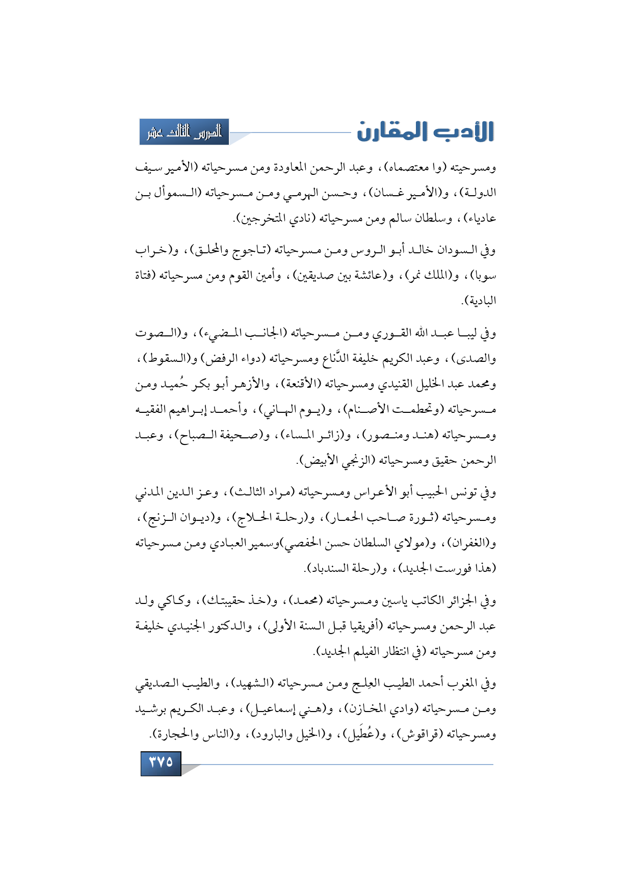 ومسرحيته (وا معتصماه)، وعبد الرحمن المعاودة ومن مسرحياته (الأمير سيف الدولة)، و (الأمير غسان)، وحسن الهرمي ومن مسرحياته (السماؤل بن عادياء)، وسلطان سالم ومن مسرحياته (نادي المتخرجين).
