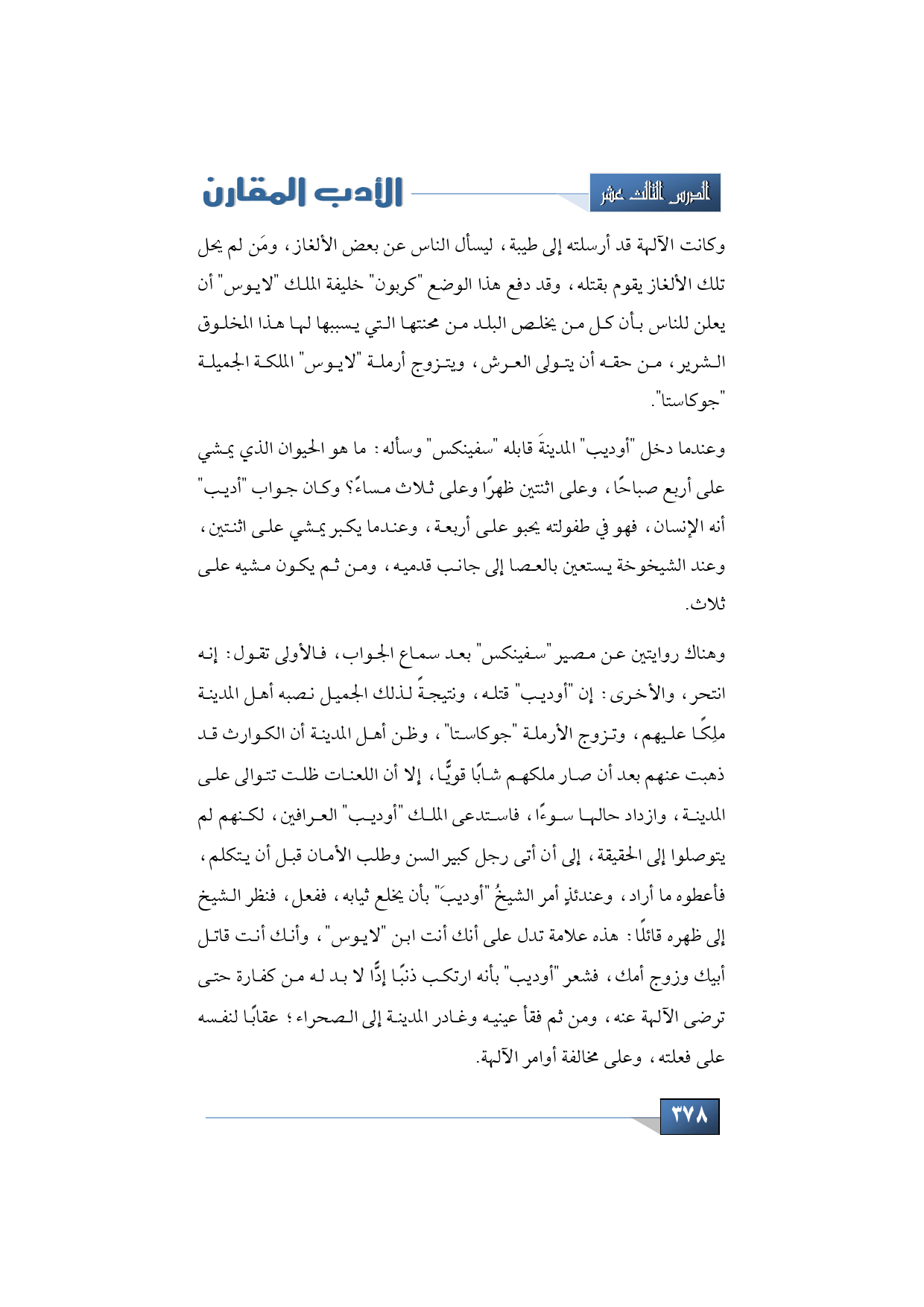 وعندما دخل "أوديب" المدينةَ قابله "سفينكس" وسأله: ما هو الحيوان الذي يمشي على أربع صباحًا، وعلى اثنتين ظهرًا وعلى ثلاث مساءً؟ وكان جواب "أديب" أنه الإنسان، فهو في طفولته يحبو على أربعة، وعندما يكبر يمشي على اثنتين، وعند الشيخوخة يستعين بالعصا إلى جانب قدميه، ومن ثم يكون مشيه على ثلاث.