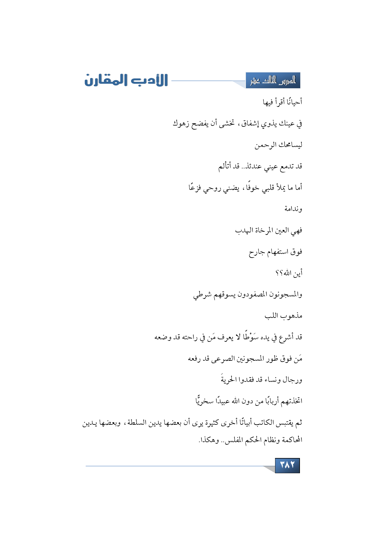 ثم يقتبس الكاتب أبياتًا أخرى كثيرة يرى أن بعضها يدين السلطة، وبعضها يدين المحاكمة ونظام الحكم المفلس .. وهكذا.
