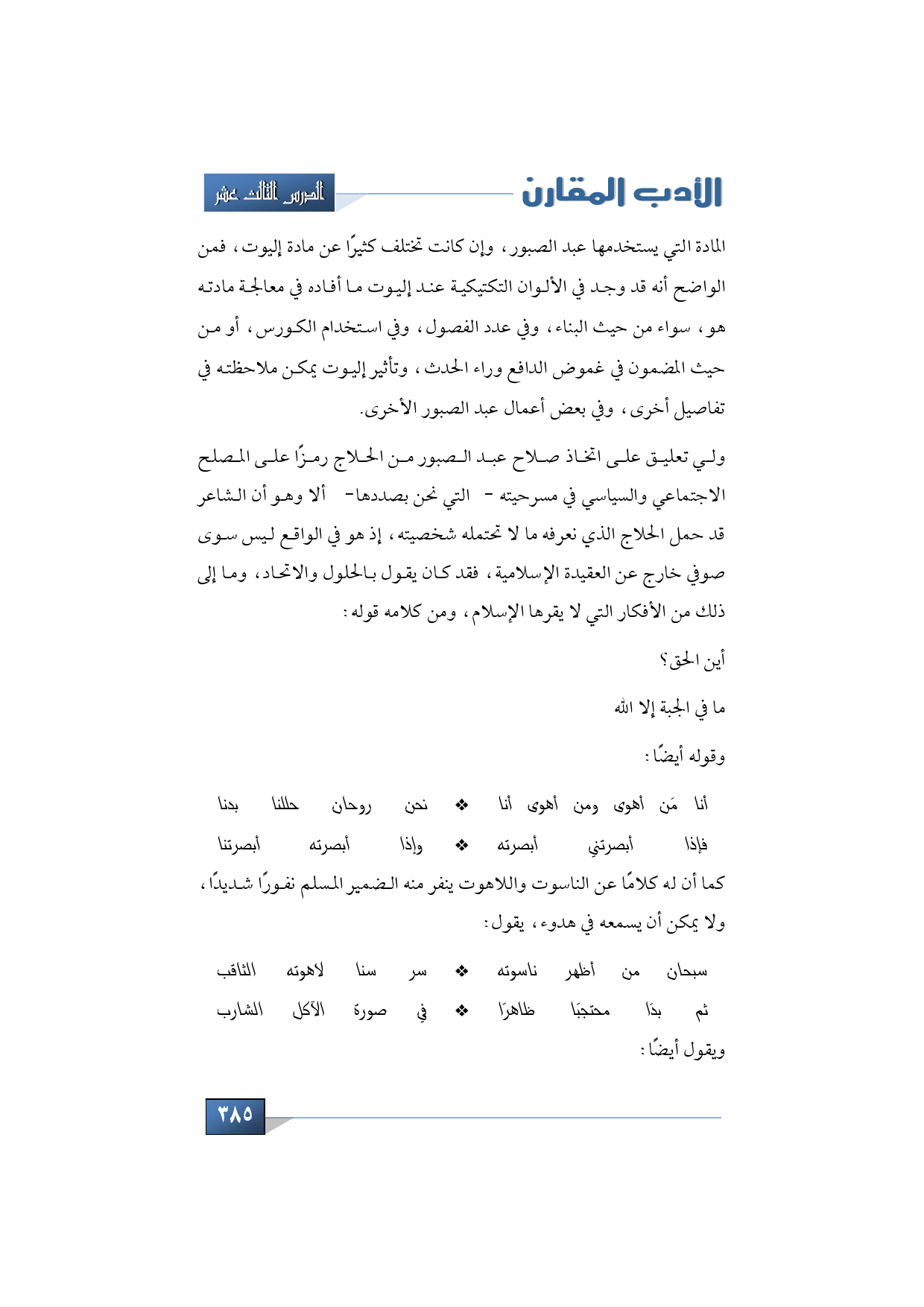 ولي تعليق على اتخاذ صلاح عبد الصبور من الحلاج رمزًا على المصلح الاجتماعي والسياسي في مسرحيته -التي نحن بصددها- ألا وهو أن الشاعر قد حمل الحلاج الذي نعرفه ما لا تحتمله شخصيته، إذ هو في الواقع ليس سوى صوفي خارج عن العقيدة الإسلامية، فقد كان يقول بالحلول والاتحاد، وما إلى ذلك من الأفكار التي لا يقرها الإسلام، ومن كلامه قوله: