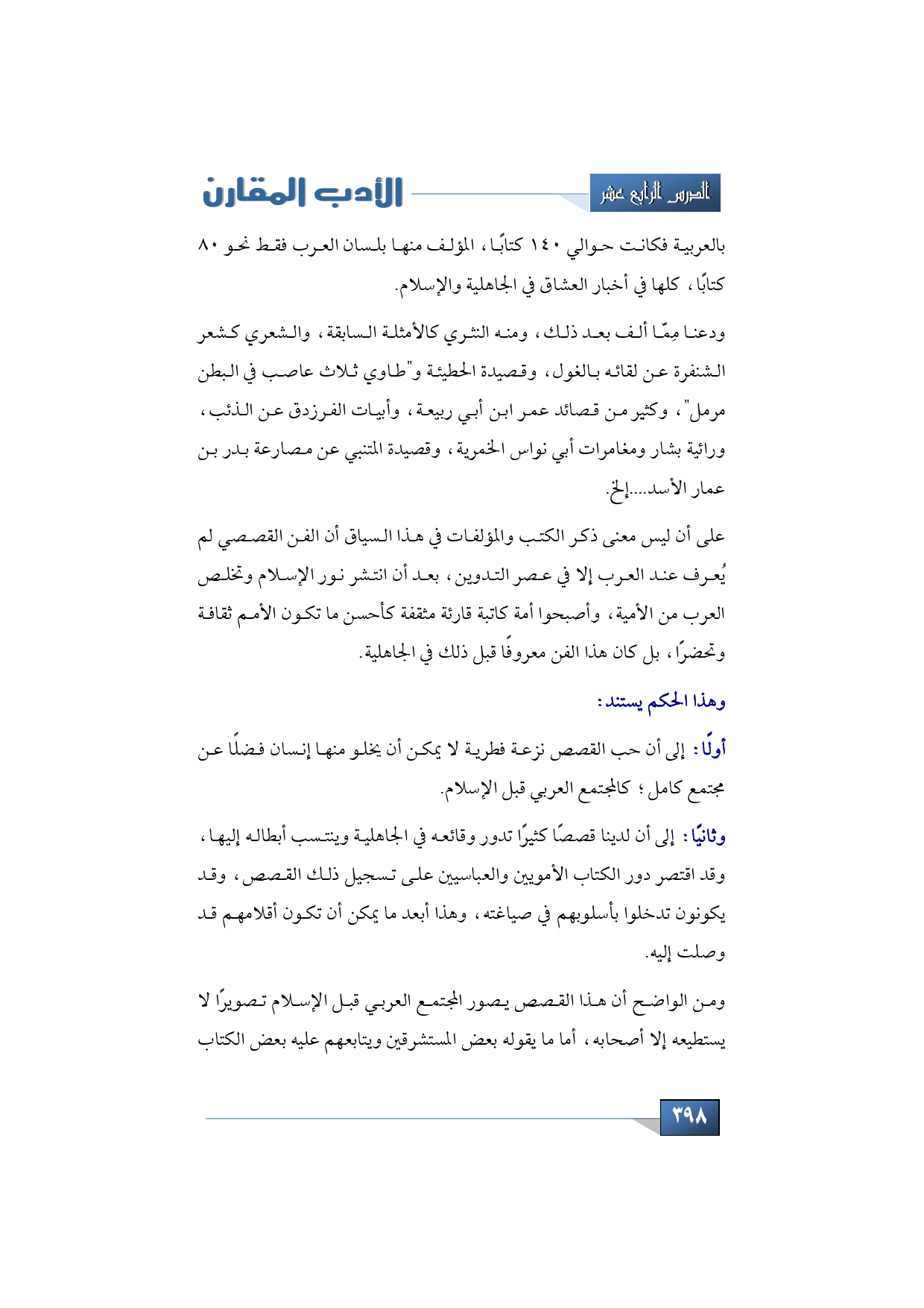 وثانيًا: إلى أن لدينا قصصًا كثيرًا تدور وقائعه في الجاهلية وينتسب أبطاله إليها، وقد اقتصر دور الكتاب الأمويين والعباسيين على تسجيل ذلك القصص، وقد يكونون تدخلوا بأسلوبهم في صياغته، وهذا أبعد ما يمكن أن تكون أقلامهم قد وصلت إليه.
