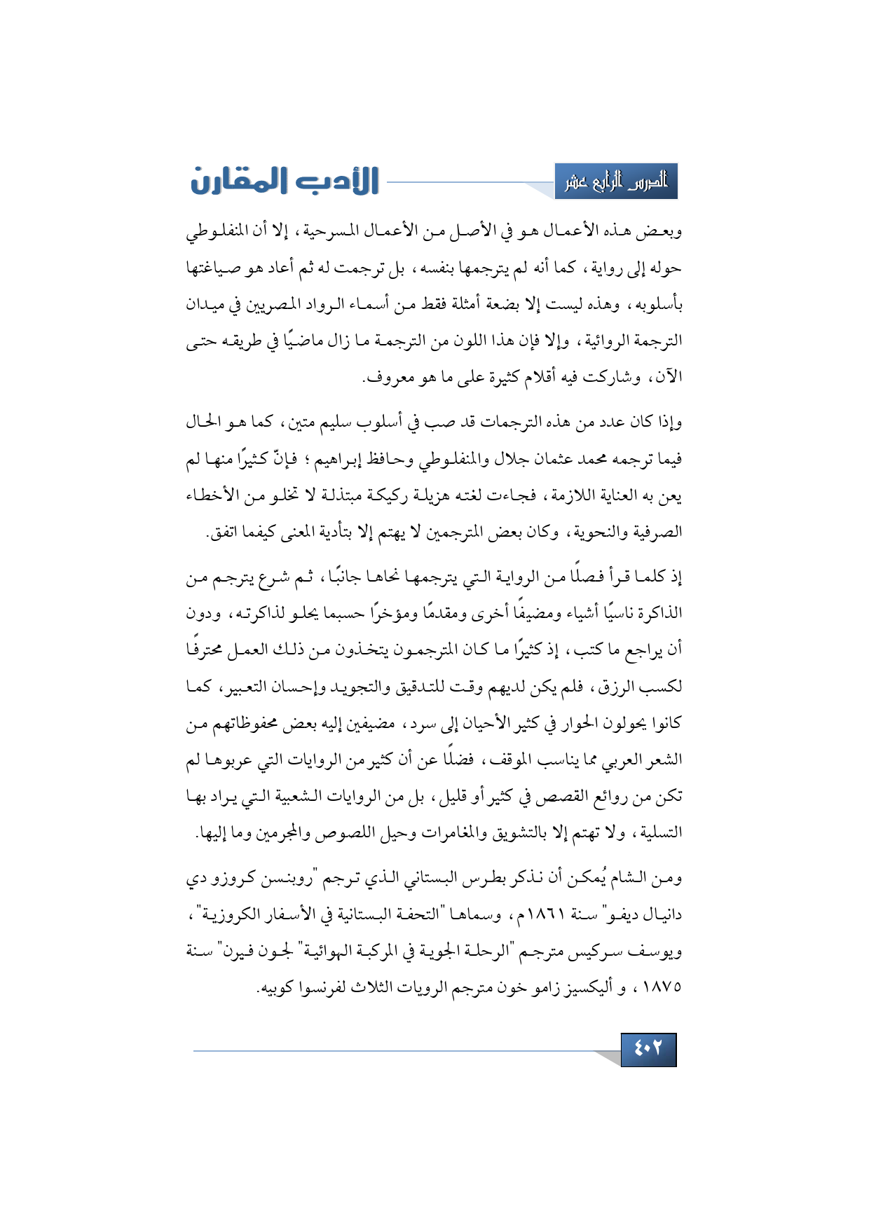 وبعض هذه الأعمال هو في الأصل من الأعمال المسرحية، إلا أن المنفلوطي حوله إلى رواية، كما أنه لم يترجمها بنفسه، بل ترجمت له ثم أعاد هو صياغتها بأسلوبه، وهذه ليست إلا بضعة أمثلة فقط من أسماء الرواد المصريين في ميدان الترجمة الروائية، وإلا فإن هذا اللون من الترجمة ما زال ماضيًا في طريقه حتى الآن، وشاركت فيه أقلام كثيرة على ما هو معروف.