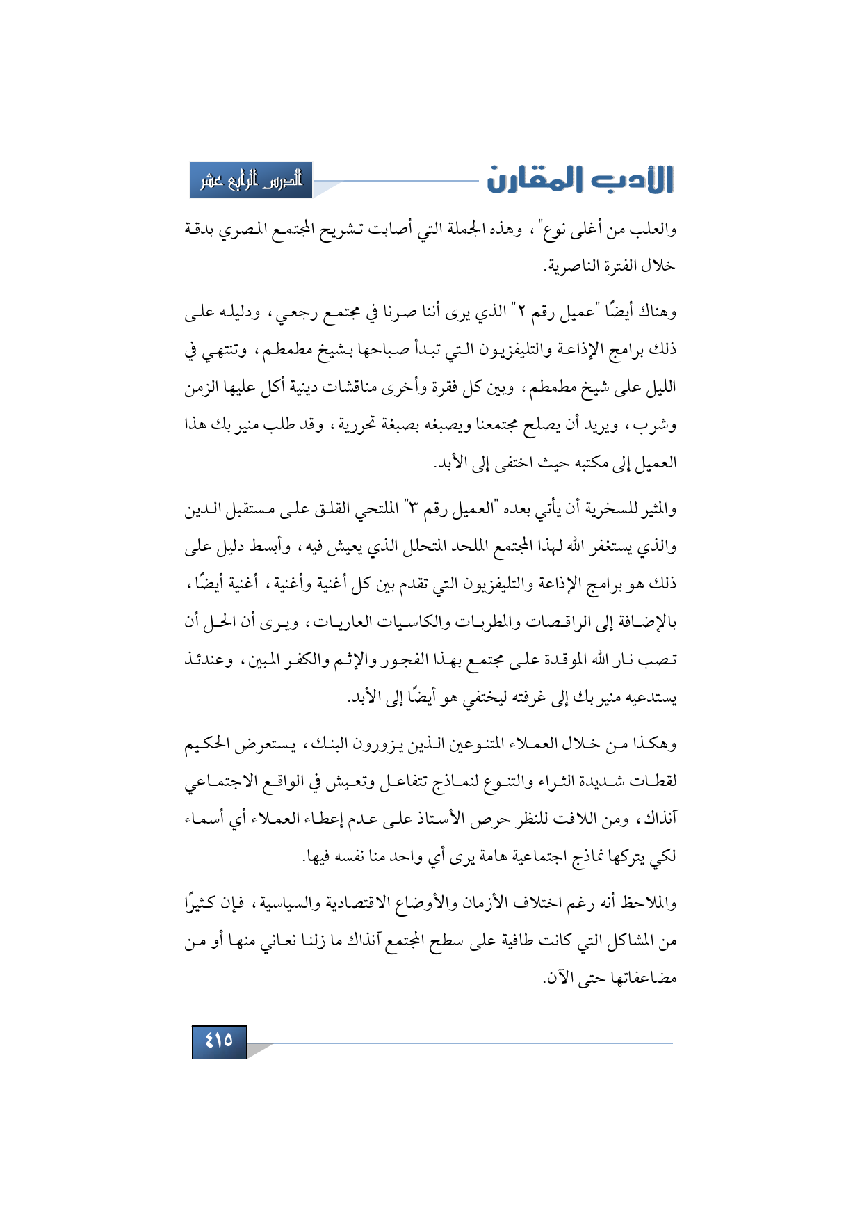وهكذا من خلال العملاء المتنوعين الذين يزورون البنك، يستعرض الحكيم لقطات شديدة الثراء والتنوع لنماذج تتفاعل وتعيش في الواقع الاجتماعي آنذاك، ومن اللافت للنظر حرص الأستاذ على عدم إعطاء العملاء أي أسماء لكي يتركها نماذج اجتماعية هامة يرى أي واحد منا نفسه فيها.