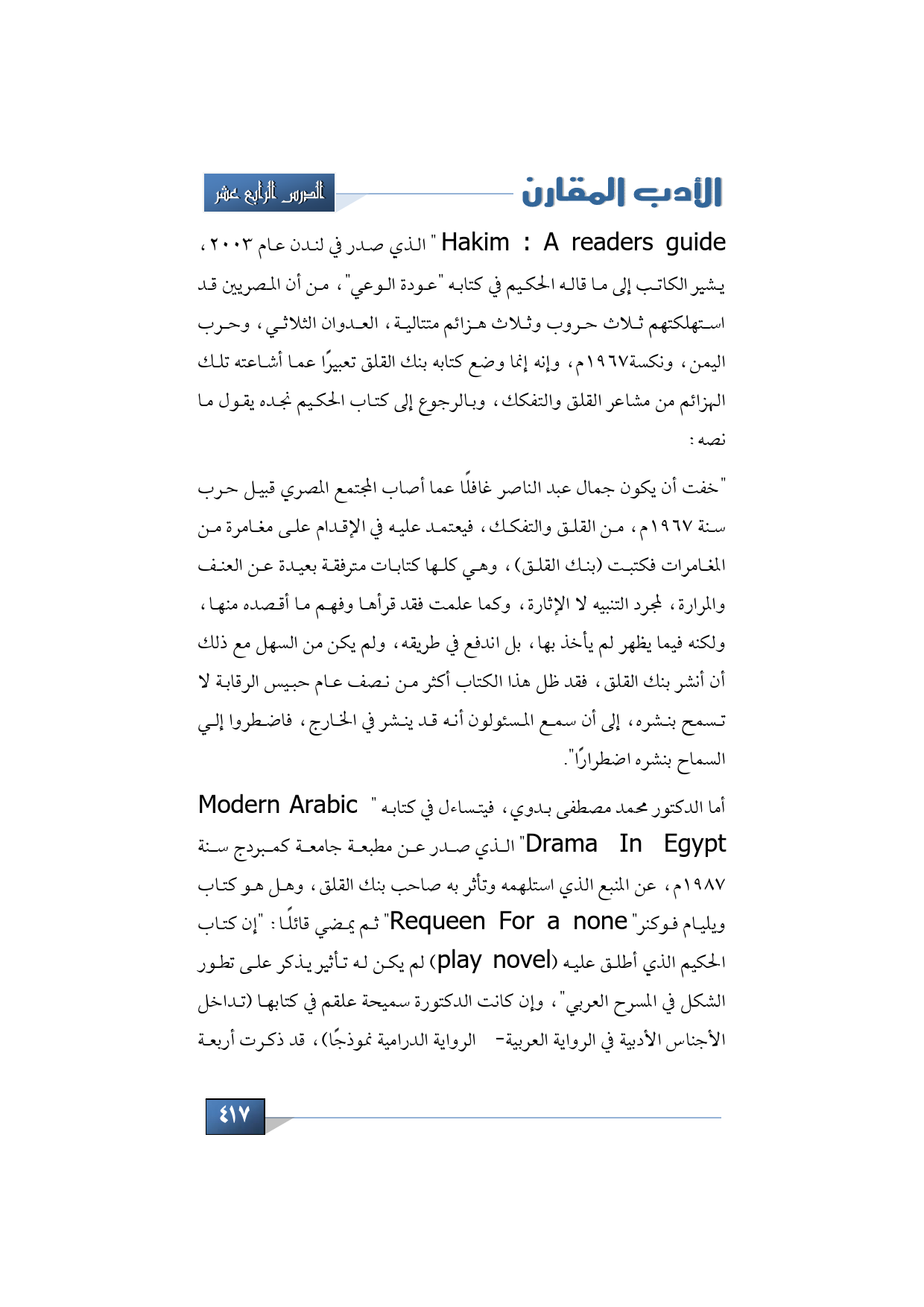 readers guide " الذي صدر في لندن عام 2003، يشير الكاتب إلى ما قاله الحكيم في كتابه "عودة الوعي"، من أن المصريين قد استهلكتهم ثلاث حروب وثلاث هزائم متتالية، العدوان الثلاثي، وحرب اليمن، ونكسة1967، وإنه إنما وضع كتابه بنك القلق تعبيرًا عما أشاعته تلك الهزائم من مشاعر القلق والتفكك، وبالرجوع إلى كتاب الحكيم نجده يقول ما نصه: