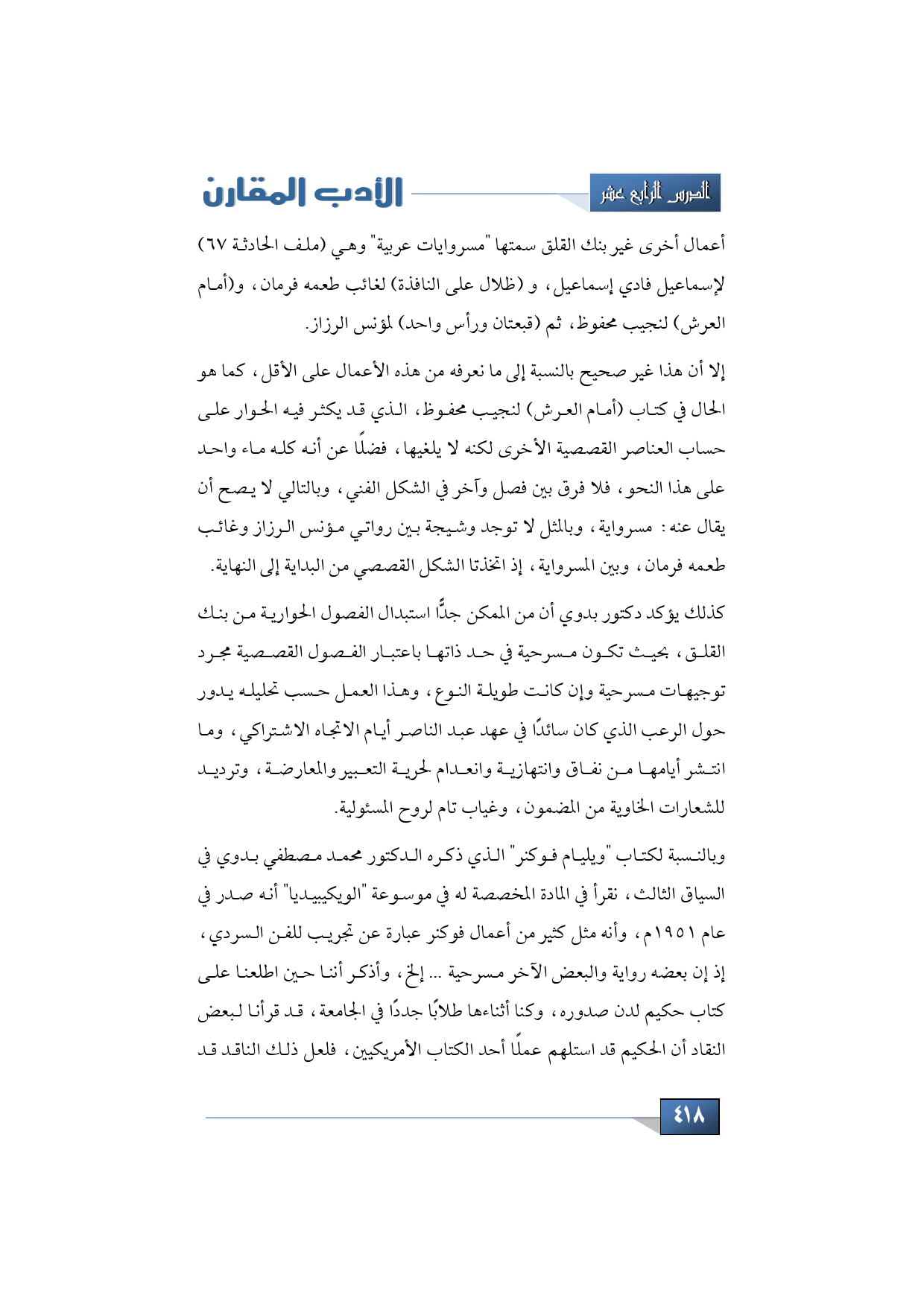 وبالنسبة لكتاب "ويليام فوكنر" الذي ذكره الدكتور محمد مصطفي بدوي في السياق الثالث، نقرأ في المادة المخصصة له في موسوعة "الويكيبيديا" أنه صدر في عام 1951، وأنه مثل كثير من أعمال فوكنر عبارة عن تجريب للفن السردي، إذ إن بعضه رواية والبعض الآخر مسرحية ... إلخ، وأذكر أننا حين اطلعنا على كتاب حكيم لدن صدوره، وكنا أثناءها طلابًا جددًا في الجامعة، قد قرأنا لبعض النقاد أن الحكيم قد استلهم عملًا أحد الكتاب الأمريكيين، فلعل ذلك الناقد قد