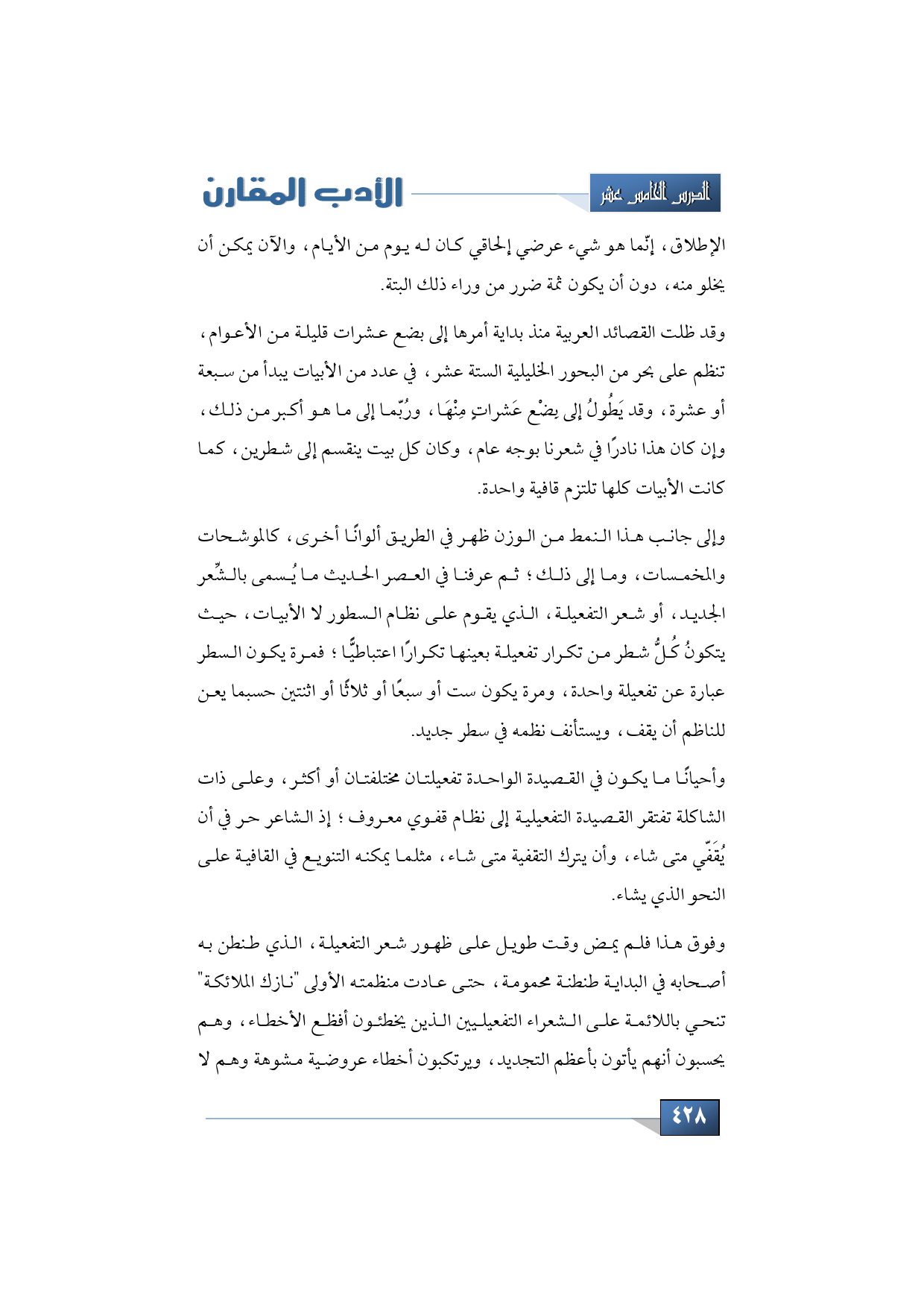 وإلى جانب هذا النمط من الوزن ظهر في الطريق ألوانًا أخرى، كالموشحات والمخمسات، وما إلى ذلك؛ ثم عرفنا في العصر الحديث ما يُسمى بالشِّعر الجديد، أو شعر التفعيلة، الذي يقوم على نظام السطور لا الأبيات، حيث يتكونُ كُلُّ شطر من تكرار تفعيلة بعينها تكرارًا اعتباطيًّا؛ فمرة يكون السطر عبارة عن تفعيلة واحدة، ومرة يكون ست أو سبعًا أو ثلاثًا أو اثنتين حسبما يعن للناظم أن يقف، ويستأنف نظمه في سطر جديد.