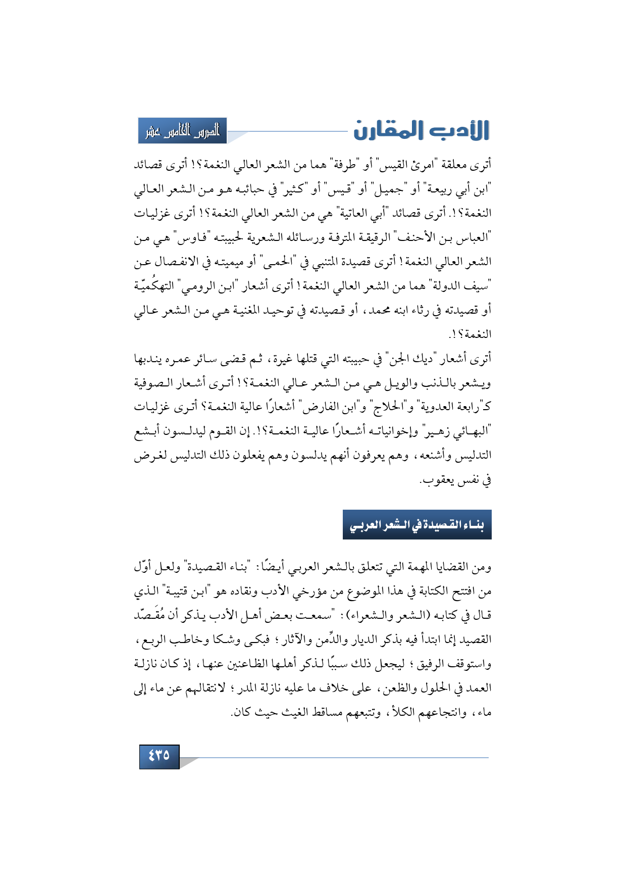 ومن القضايا المهمة التي تتعلق بالشعر العربي أيضًا: "بناء القصيدة" ولعل أوّل من افتتح الكتابة في هذا الموضوع من مؤرخي الأدب ونقاده هو "ابن قتيبة" الذي قال في كتابه (الشعر والشعراء): "سمعت بعض أهل الأدب يذكر أن مُقَصّد القصيد إنما ابتدأ فيه بذكر الديار والدِّمن والآثار؛ فبكى وشكا وخاطب الربع، واستوقف الرفيق؛ ليجعل ذلك سببًا لذكر أهلها الظاعنين عنها، إذ كان نازلة العمد في الحلول والظعن، على خلاف ما عليه نازلة المدر؛ لانتقالهم عن ماء إلى ماء، وانتجاعهم الكلأ، وتتبعهم مساقط الغيث حيث كان.