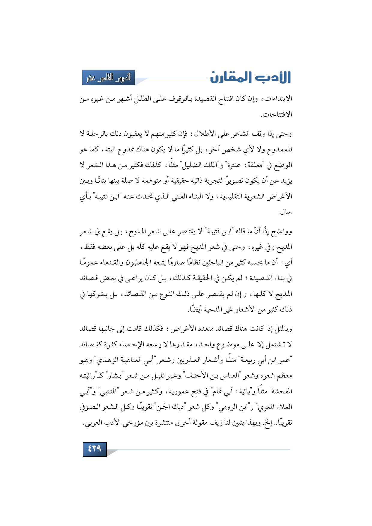 وواضح إذًا أنّ ما قاله "ابن قتيبة" لا يقتصر على شعر المديح، بل يقع في شعر المديح وفي غيره، وحتى في شعر المديح فهو لا يقع عليه كله بل على بعضه فقط, أي: أن ما يحسبه كثير من الباحثين نظامًا صارمًا يتبعه الجاهليون والقدماء عمومًا في بناء القصيدة؛ لم يكن في الحقيقة كذلك، بل كان يراعى في بعض قصائد المديح لا كلها، وإن لم يقتصر على ذلك النوع من القصائد، بل يشركها في ذلك كثير من الأشعار غير المدحية أيضًا.