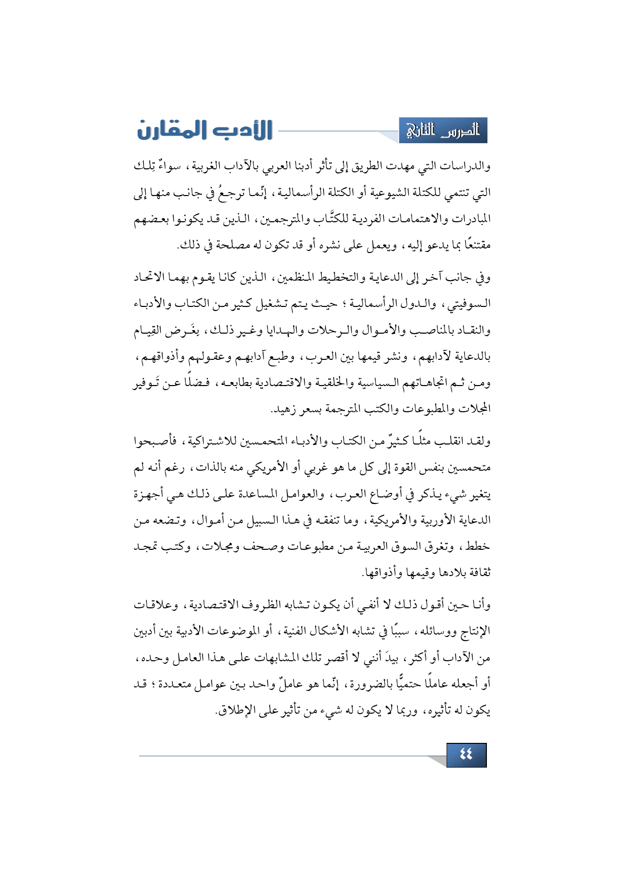 وأنا حين أقول ذلك لا أنفي أن يكون تشابه الظروف الاقتصادية، وعلاقات الإنتاج ووسائله، سببًا في تشابه الأشكال الفنية، أو الموضوعات الأدبية بين أدبين من الآداب أو أكثر، بيدَ أنني لا أقصر تلك المشابهات على هذا العامل وحده، أو أجعله عاملًا حتميًّا بالضرورة، إنّما هو عاملٌ واحد بين عوامل متعددة؛ قد يكون له تأثيره، وربما لا يكون له شيء من تأثير على الإطلاق.