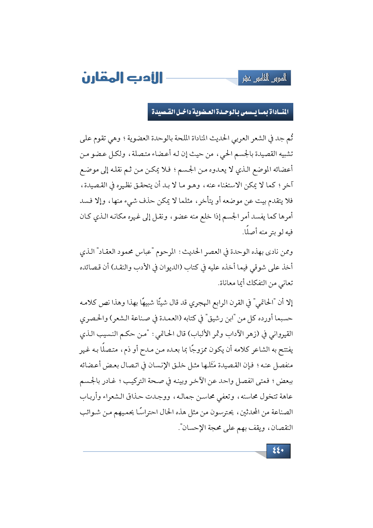 ثُم جد في الشعر العربي الحديث المناداة الملحة بالوحدة العضوية؛ وهي تقوم على تشبيه القصيدة بالجسم الحي، من حيث إن له أعضاء متصلة، ولكل عضو من أعضائه الموضع الذي لا يعدوه من الجسم؛ فلا يمكن من ثم نقله إلى موضع آخر؛ كما لا يمكن الاستغناء عنه, وهو ما لا بد أن يتحقق نظيره في القصيدة، فلا يتقدم بيت عن موضعه أو يتأخر، مثلما لا يمكن حذف شيء منها، وإلا فسد أمرها كما يفسد أمر الجسم إذا خلع منه عضو، ونقل إلى غيره مكانه الذي كان فيه لو بتر منه أصلًا.