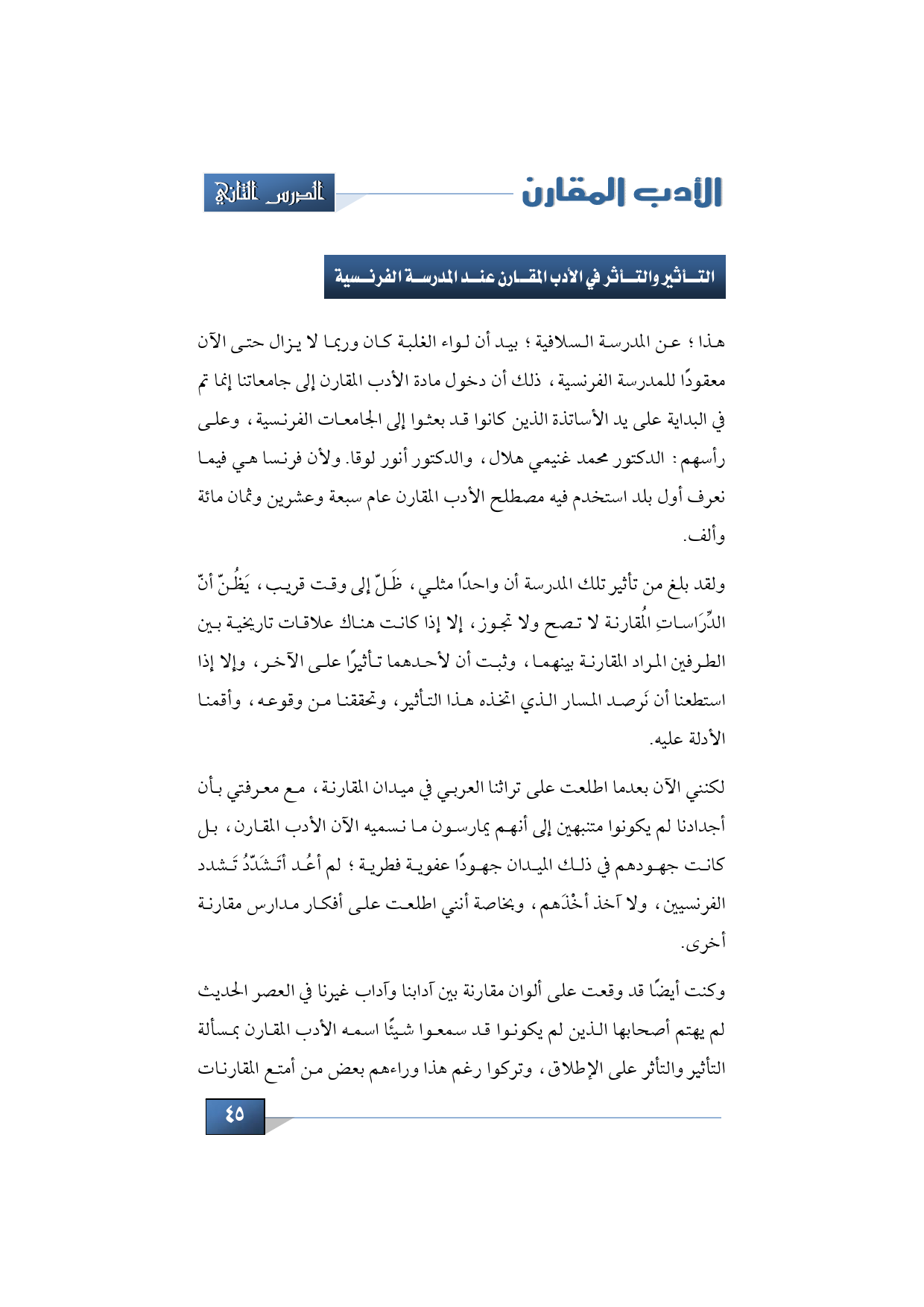 لكنني الآن بعدما اطلعت على تراثنا العربي في ميدان المقارنة، مع معرفتي بأن أجدادنا لم يكونوا متنبهين إلى أنهم يمارسون ما نسميه الآن الأدب المقارن، بل كانت جهودهم في ذلك الميدان جهودًا عفوية فطرية؛ لم أعُد أتَشَدّدُ تَشدد الفرنسيين، ولا آخذ أخْذَهم، وبخاصة أنني اطلعت على أفكار مدارس مقارنة أخرى.