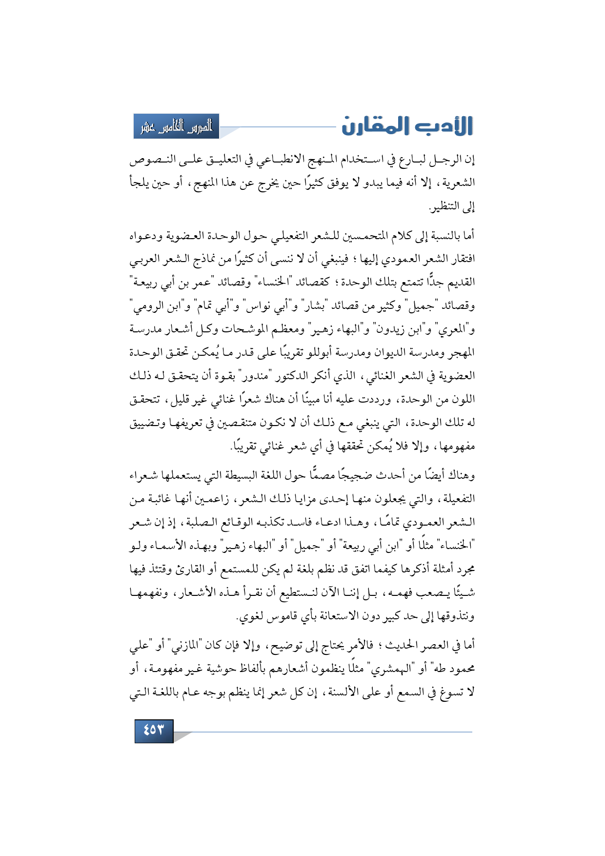 إن الرجل لبارع في استخدام المنهج الانطباعي في التعليق على النصوص الشعرية، إلا أنه فيما يبدو لا يوفق كثيرًا حين يخرج عن هذا المنهج، أو حين يلجأ إلى التنظير.