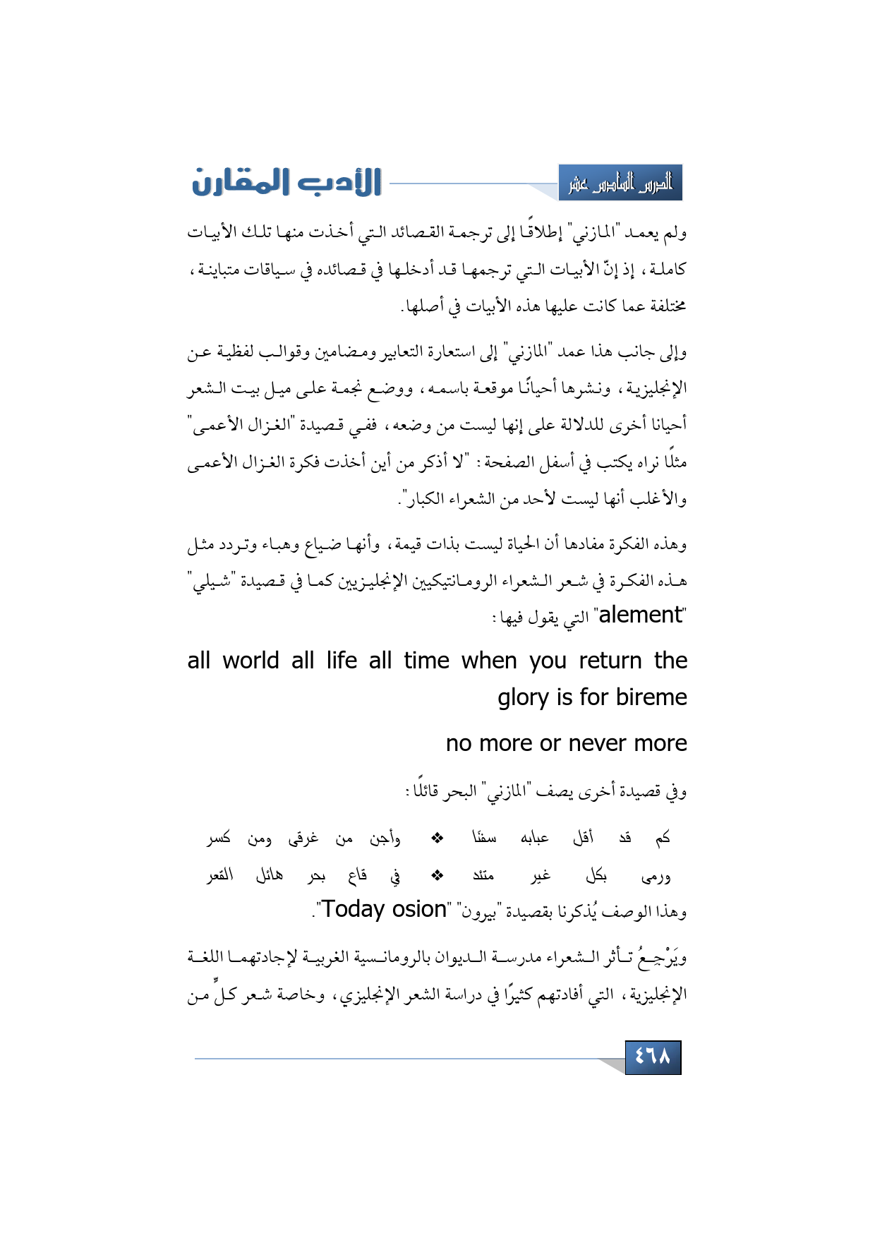 ولم يعمد "المازني" إطلاقًا إلى ترجمة القصائد التي أخذت منها تلك الأبيات كاملة، إذ إنّ الأبيات التي ترجمها قد أدخلها في قصائده في سياقات متباينة، مختلفة عما كانت عليها هذه الأبيات في أصلها.