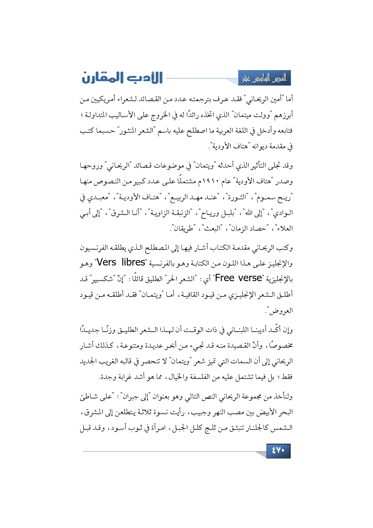 وإن أكّد أديبنا اللبناني في ذات الوقت أن لهذا الشعر الطليق وزنًا جديدًا مخصوصًا، وأنّ القصيدة منه قد تجيء من أبحر عديدة ومتنوعة, كذلك أشار الريحاني إلى أن السمات التي تميز شعر "ويتمان" لا تنحصر في قالبه الغريب الجديد فقط؛ بل فيما تشتمل عليه من الفلسفة والخيال، مما هو أشد غرابة وجدة.