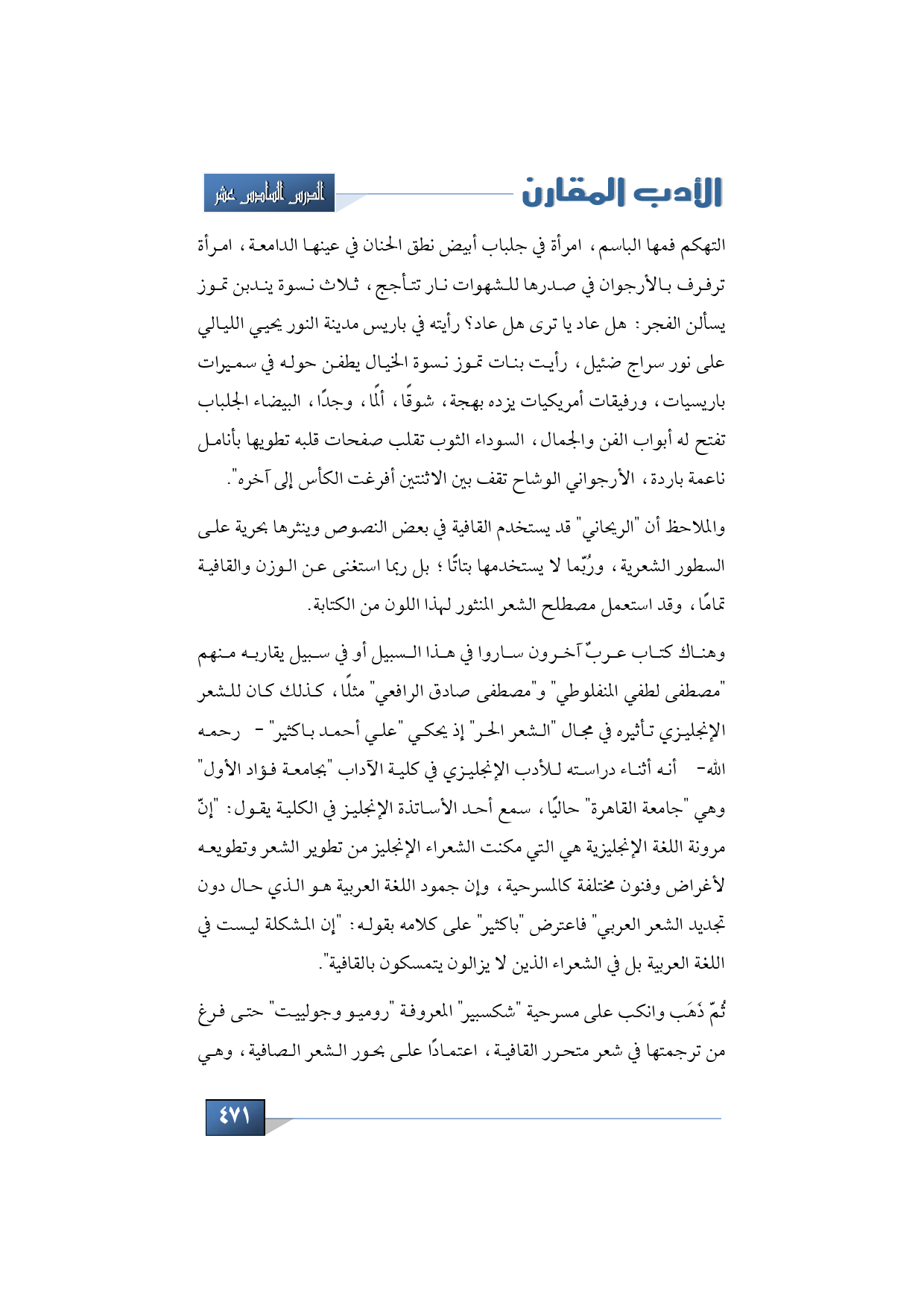 وهناك كتاب عربٌ آخرون ساروا في هذا السبيل أو في سبيل يقاربه منهم "مصطفى لطفي المنفلوطي" و"مصطفى صادق الرافعي" مثلًا, كذلك كان للشعر الإنجليزي تأثيره في مجال "الشعر الحر" إذ يحكي "علي أحمد باكثير" -رحمه الله- أنه أثناء دراسته للأدب الإنجليزي في كلية الآداب "بجامعة فؤاد الأول" وهي "جامعة القاهرة" حاليًا، سمع أحد الأساتذة الإنجليز في الكلية يقول: "إنّ مرونة اللغة الإنجليزية هي التي مكنت الشعراء الإنجليز من تطوير الشعر وتطويعه لأغراض وفنون مختلفة كالمسرحية، وإن جمود اللغة العربية هو الذي حال دون تجديد الشعر العربي" فاعترض "باكثير" على كلامه بقوله: "إن المشكلة ليست في اللغة العربية بل في الشعراء الذين لا يزالون يتمسكون بالقافية".