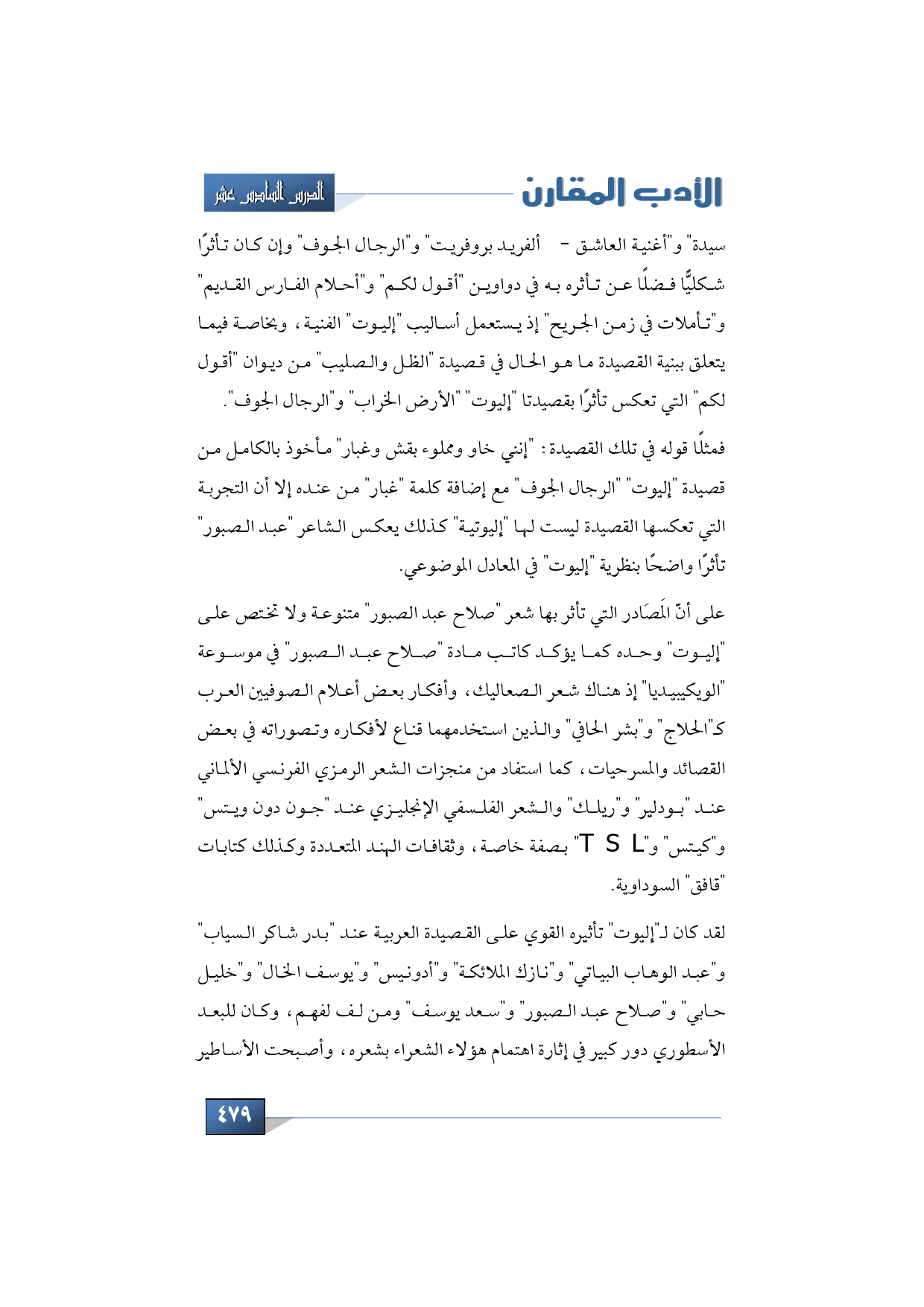 على أنّ المَصَادر التي تأثر بها شعر "صلاح عبد الصبور" متنوعة ولا تختص على "إليوت" وحده كما يؤكد كاتب مادة "صلاح عبد الصبور" في موسوعة "الويكيبيديا" إذ هناك شعر الصعاليك، وأفكار بعض أعلام الصوفيين العرب كـ"الحلاج" و"بشر الحافي" والذين استخدمهما قناع لأفكاره وتصوراته في بعض القصائد والمسرحيات، كما استفاد من منجزات الشعر الرمزي الفرنسي الألماني عند "بودلير" و"ريلك" والشعر الفلسفي الإنجليزي عند "جون دون ويتس" و"كيتس" و" T S L" بصفة خاصة، وثقافات الهند المتعددة وكذلك كتابات "قافق" السوداوية.