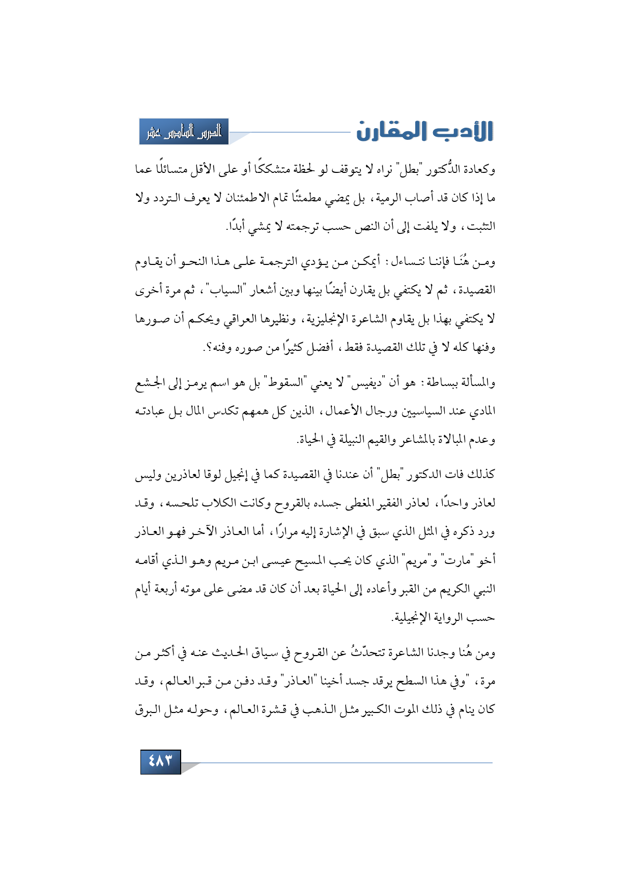 كذلك فات الدكتور "بطل" أن عندنا في القصيدة كما في إنجيل لوقا لعاذرين وليس لعاذر واحدًا, لعاذر الفقير المغطى جسده بالقروح وكانت الكلاب تلحسه، وقد ورد ذكره في المثل الذي سبق في الإشارة إليه مرارًا, أما العاذر الآخر فهو العاذر أخو "مارت" و"مريم" الذي كان يحب المسيح عيسى ابن مريم وهو الذي أقامه النبي الكريم من القبر وأعاده إلى الحياة بعد أن كان قد مضى على موته أربعة أيام حسب الرواية الإنجيلية.