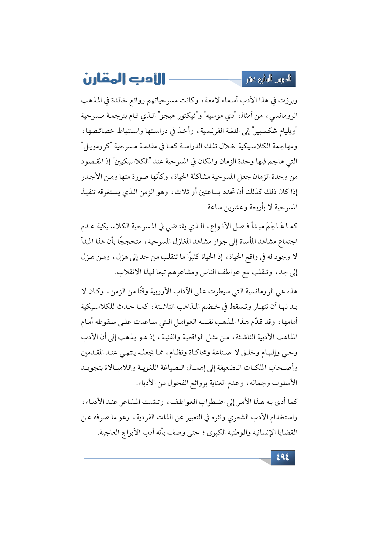 وبرزت في هذا الأدب أسماء لامعة، وكانت مسرحياتهم روائع خالدة في المذهب الرومانسي، من أمثال "ديموسيه" و"فيكتور هيجو" الذي قام بترجمة مسرحية "ويليام شكسبير" إلى اللغة الفرنسية، وأخذ في دراستها واستنباط خصائصها، ومهاجمة الكلاسيكية خلال تلك الدراسة كما في مقدمة مسرحية "كرومويل" التي هاجم فيها وحدة الزمان والمكان في المسرحية عند "الكلاسيكيين" إذ المقصود من وحدة الزمان جعل المسرحية مشاكلة الحياة، وكأنها صورة منها ومن الأجدر إذا كان ذلك كذلك أن تحدد بساعتين أو ثلاث، وهو الزمن الذي يستغرقه تنفيذ المسرحية لا بأربعة وعشرين ساعة.