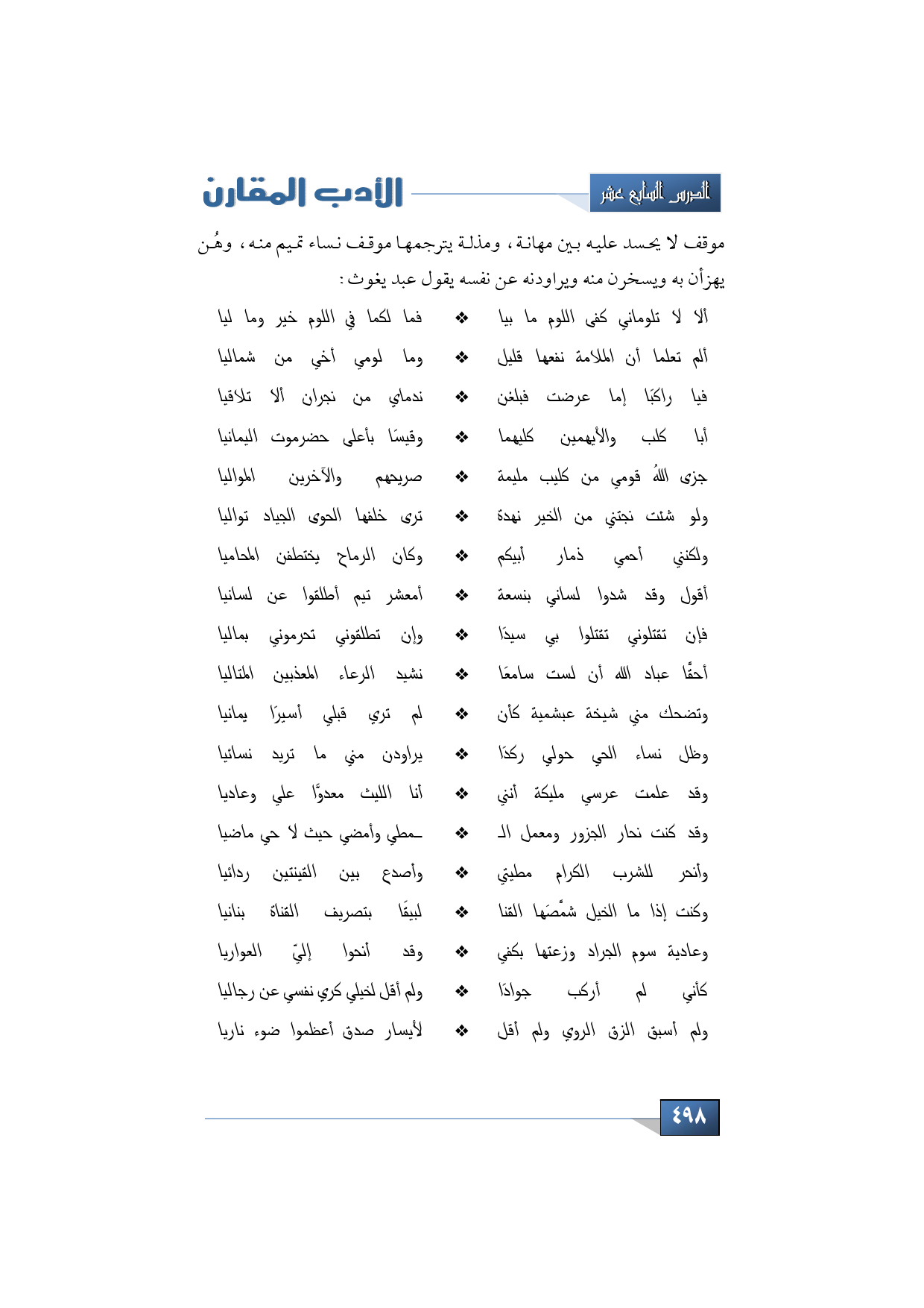 موقف لا يحسد عليه بين مهانة، ومذلة يترجمها موقف نساء تميم منه، وهُن يهزأن به ويسخرن منه ويراودنه عن نفسه يقول عبد يغوث: