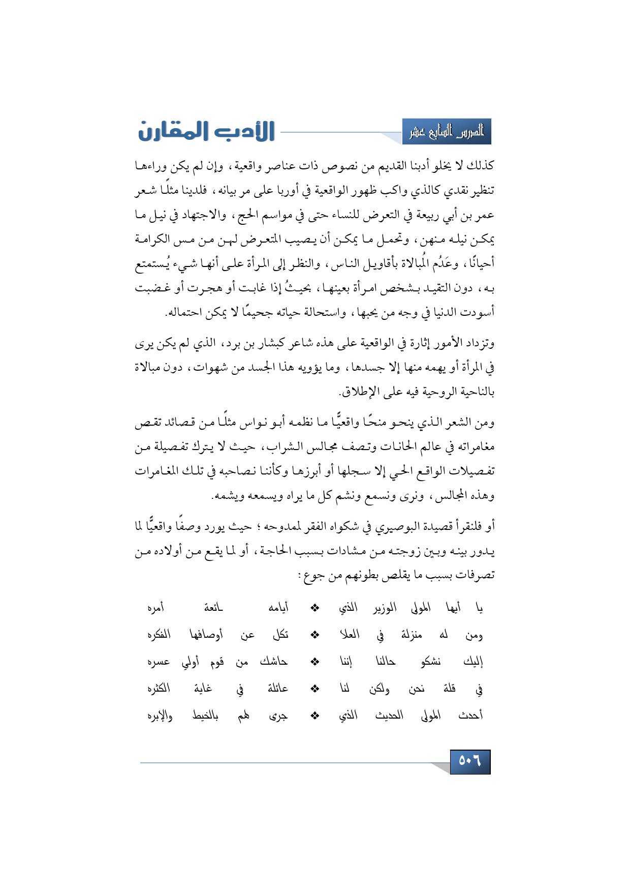 كذلك لا يخلو أدبنا القديم من نصوص ذات عناصر واقعية، وإن لم يكن وراءها تنظير نقدي كالذي واكب ظهور الواقعية في أوربا على مر بيانه، فلدينا مثلًا شعر عمر بن أبي ربيعة في التعرض للنساء حتى في مواسم الحج، والاجتهاد في نيل ما يمكن نيله منهن، وتحمل ما يمكن أن يصيب المتعرض لهن من مس الكرامة أحيانًا، وعَدُم المُبالاة بأقاويل الناس، والنظر إلى المرأة على أنها شيء يُستمتع به، دون التقيد بشخص امرأة بعينها، بحيثُ إذا غابت أو هجرت أو غضبت أسودت الدنيا في وجه من يحبها، واستحالة حياته جحيمًا لا يمكن احتماله.