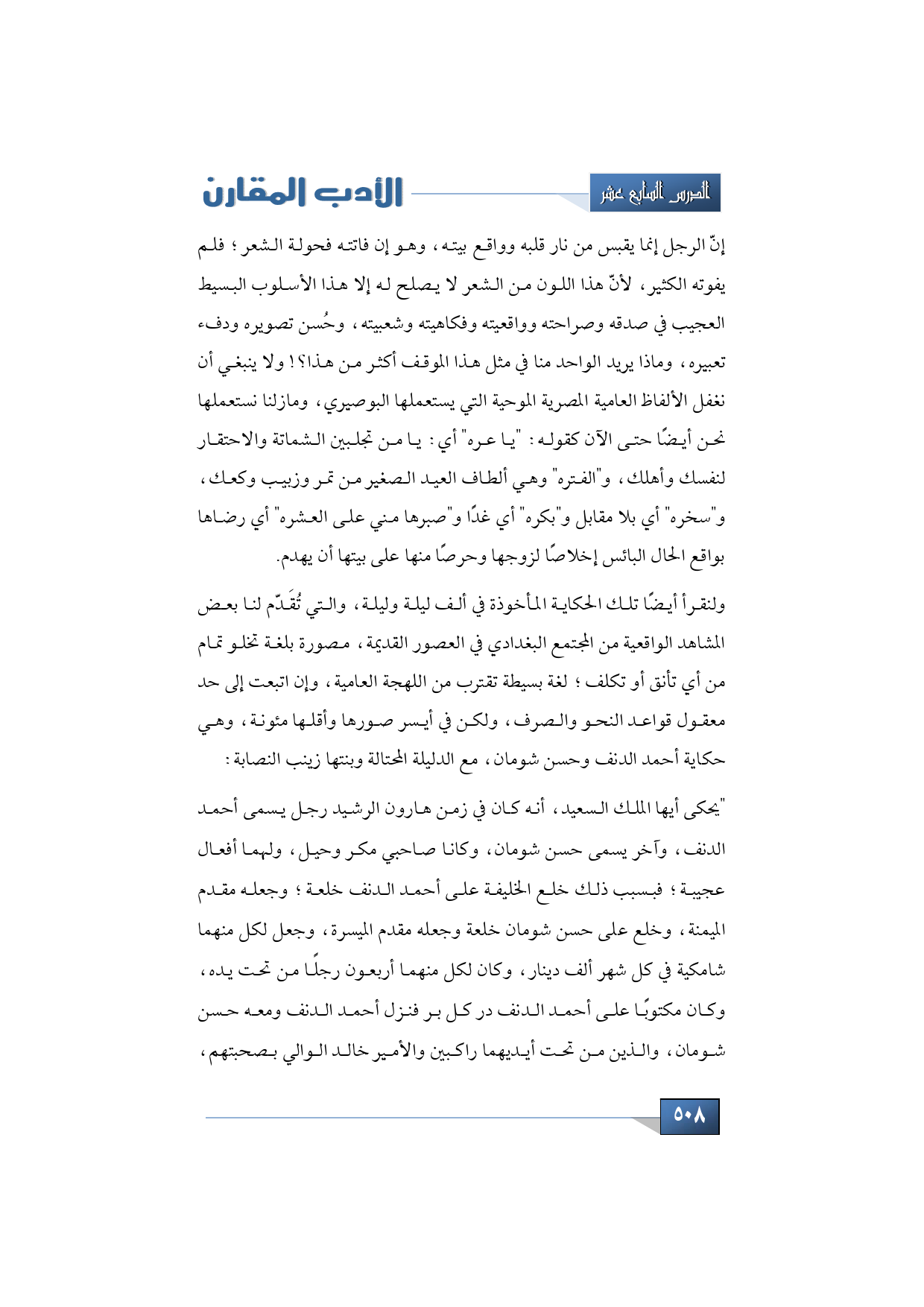 ولنقرأ أيضًا تلك الحكاية المأخوذة في ألف ليلة وليلة، والتي تُقَدّم لنا بعض المشاهد الواقعية من المجتمع البغدادي في العصور القديمة، مصورة بلغة تخلو تمام من أي تأنق أو تكلف؛ لغة بسيطة تقترب من اللهجة العامية، وإن اتبعت إلى حد معقول قواعد النحو والصرف، ولكن في أيسر صورها وأقلها مئونة، وهي حكاية أحمد الدنف وحسن شومان، مع الدليلة المحتالة وبنتها زينب النصابة:
