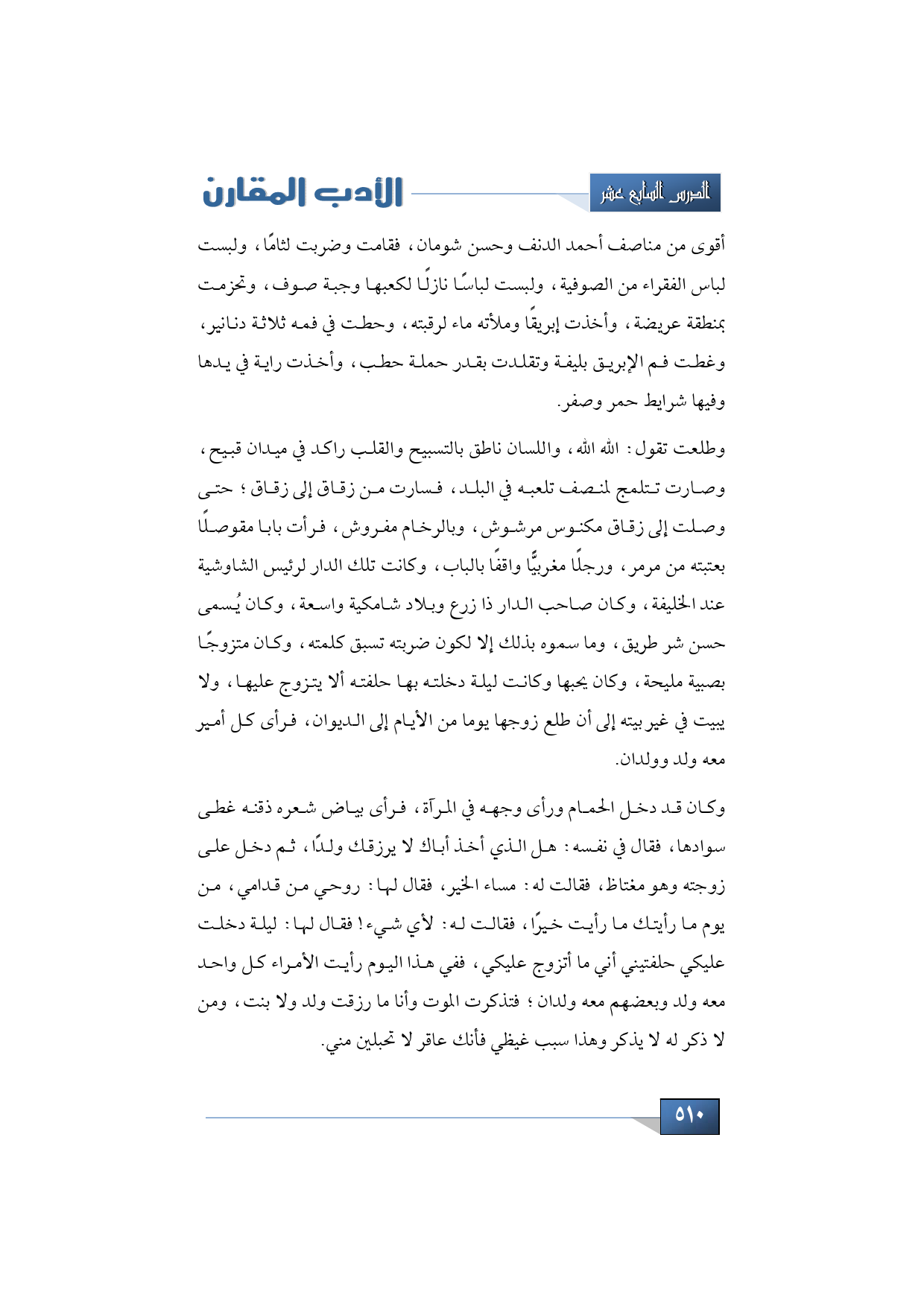 وطلعت تقول: الله الله، واللسان ناطق بالتسبيح والقلب راكد في ميدان قبيح، وصارت تتلمج لمنصف تلعبه في البلد، فسارت من زقاق إلى زقاق؛ حتى وصلت إلى زقاق مكنوس مرشوش، وبالرخام مفروش، فرأت بابا مقوصلًا بعتبته من مرمر، ورجلًا مغربيًّا واقفًا بالباب، وكانت تلك الدار لرئيس الشاوشية عند الخليفة، وكان صاحب الدار ذا زرع وبلاد شامكية واسعة، وكان يُسمى حسن شر طريق، وما سموه بذلك إلا لكون ضربته تسبق كلمته، وكان متزوجًا بصبية مليحة، وكان يحبها وكانت ليلة دخلته بها حلفته ألا يتزوج عليها، ولا يبيت في غير بيته إلى أن طلع زوجها يوما من الأيام إلى الديوان، فرأى كل أمير معه ولد وولدان.