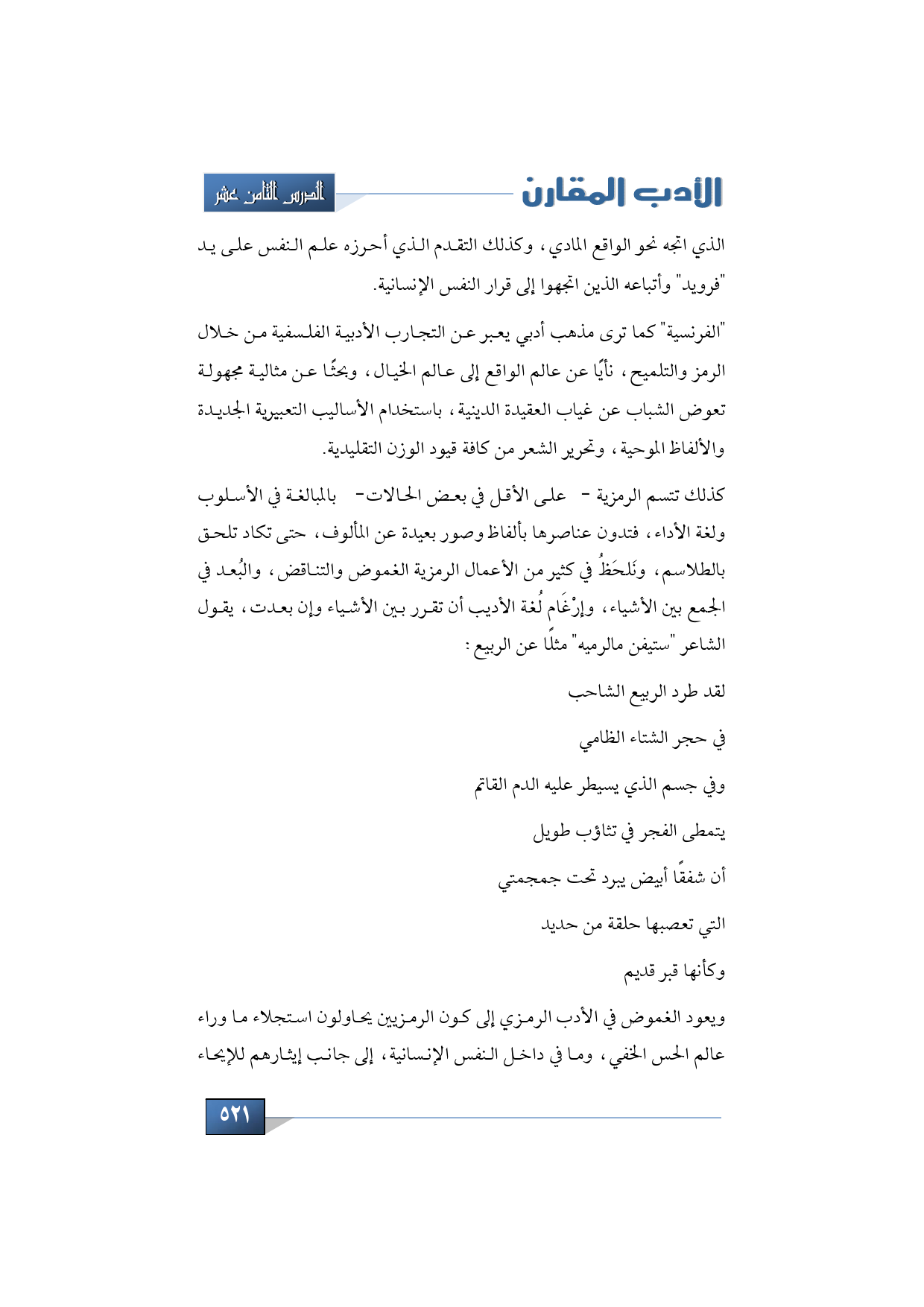 "الفرنسية" كما ترى مذهب أدبي يعبر عن التجارب الأدبية الفلسفية من خلال الرمز والتلميح، نأيًا عن عالم الواقع إلى عالم الخيال، وبحثًا عن مثالية مجهولة تعوض الشباب عن غياب العقيدة الدينية، باستخدام الأساليب التعبيرية الجديدة والألفاظ الموحية، وتحرير الشعر من كافة قيود الوزن التقليدية.