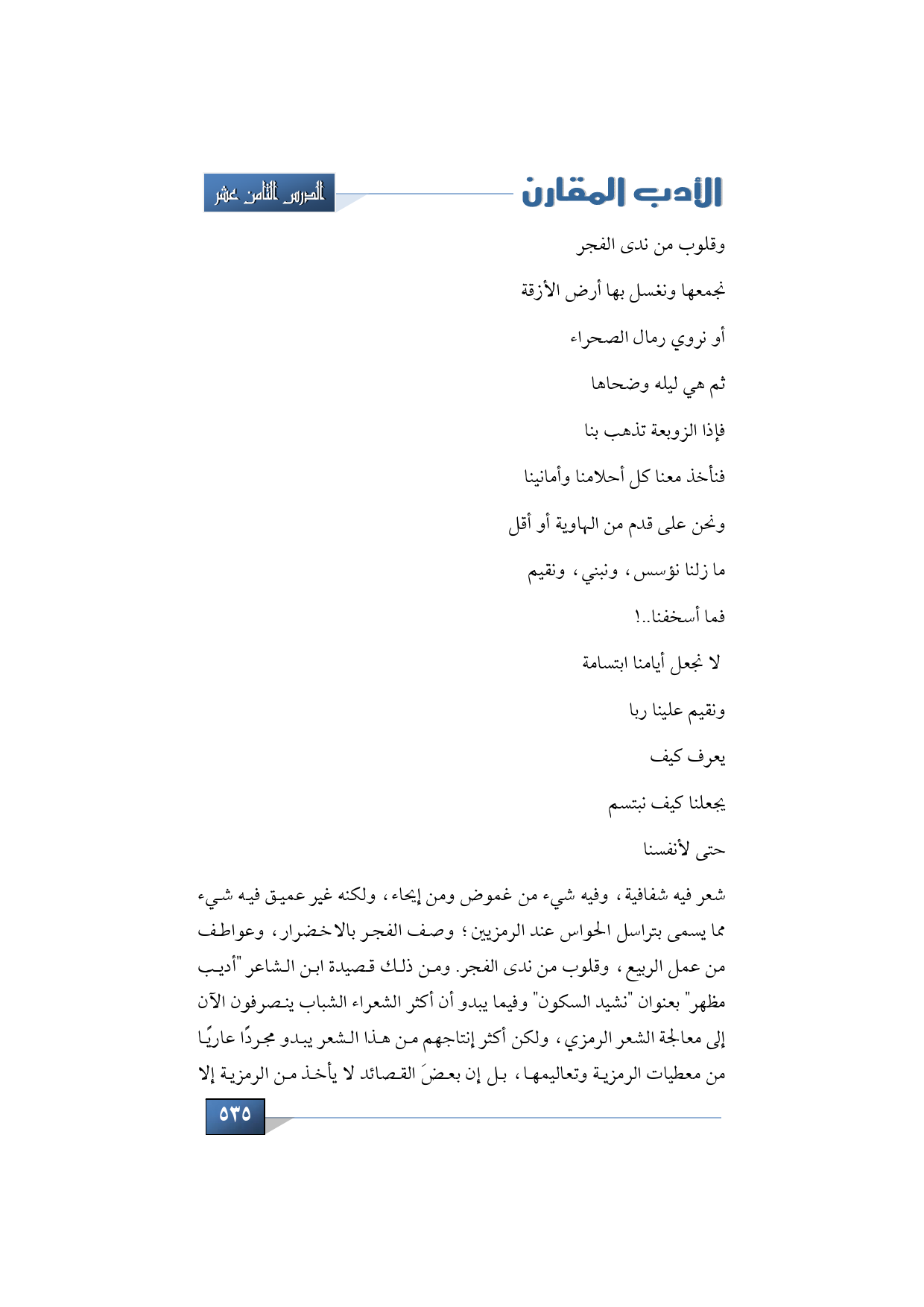 شعر فيه شفافية، وفيه شيء من غموض ومن إيحاء، ولكنه غير عميق فيه شيء مما يسمى بتراسل الحواس عند الرمزيين؛ وصف الفجر بالاخضرار، وعواطف من عمل الربيع، وقلوب من ندى الفجر. ومن ذلك قصيدة ابن الشاعر "أديب مظهر" بعنوان "نشيد السكون" وفيما يبدو أن أكثر الشعراء الشباب ينصرفون الآن إلى معالجة الشعر الرمزي، ولكن أكثر إنتاجهم من هذا الشعر يبدو مجردًا عاريًا من معطيات الرمزية وتعاليمها، بل إن بعضَ القصائد لا يأخذ من الرمزية إلا