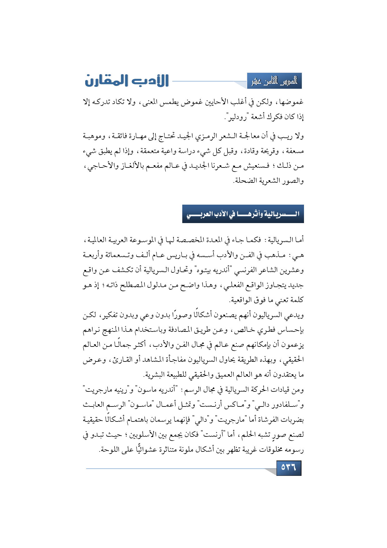 أما السريالية: فكما جاء في المعدة المخصصة لها في الموسوعة العربية العالمية، هي: مذهب في الفن والأدب أسسه في باريس عام ألف وتسعمائة وأربعة وعشرين الشاعر الفرنسي "أندريه بيتوه" وتحاول السريالية أن تكشف عن واقع جديد يتجاوز الواقع الفعلي، وهذا واضح من مدلول المصطلح ذاته؛ إذ هو كلمة تعني ما فوق الواقعية.