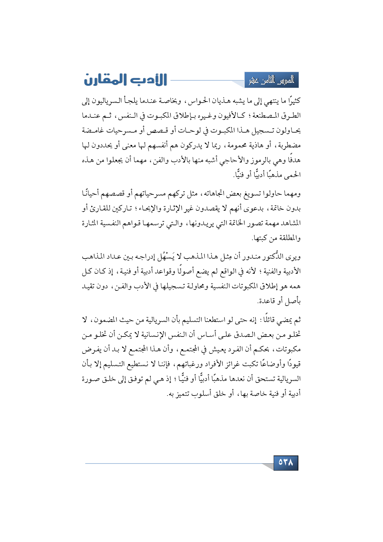 ثم يمضي قائلًا: إنه حتى لو استطعنا التسليم بأن السريالية من حيث المضمون، لا تخلو من بعض الصدق على أساس أن النفس الإنسانية لا يمكن أن تخلو من مكبوتات، بحكم أن الفرد يعيش في المجتمع، وأن هذا المجتمع لا بد أن يفرض قيودًا وأوضاعًا تكبت غرائز الأفراد ورغباتهم، فإننا لا نستطيع التسليم إلا بأن السريالية تستحق أن نعدها مذهبًا أدبيًّا أو فنيًّا؛ إذ هي لم توفق إلى خلق صورة أدبية أو فنية خاصة بها، أو خلق أسلوب تتميز به.