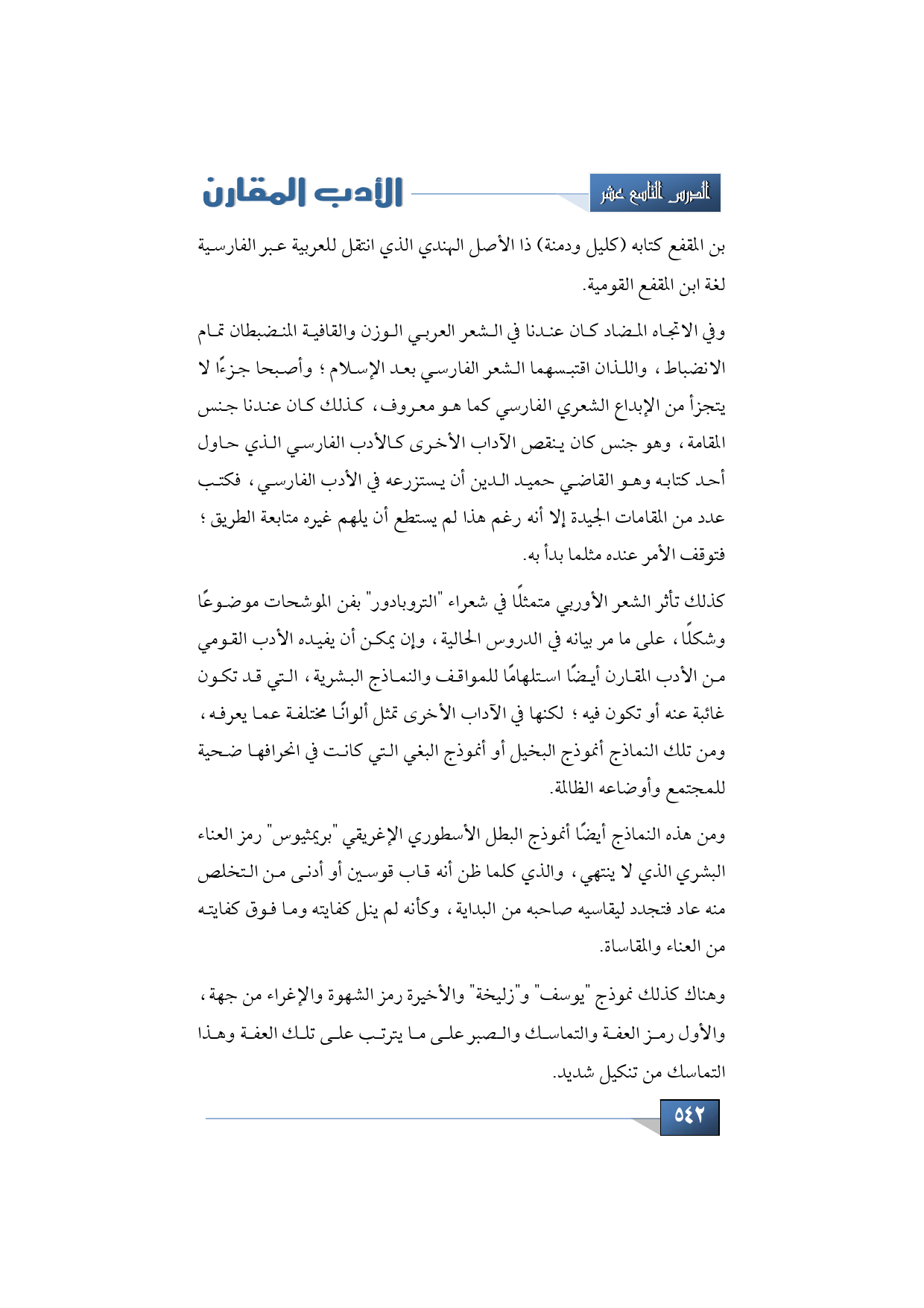 كذلك تأثر الشعر الأوربي متمثلًا في شعراء "التروبادور" بفن الموشحات موضوعًا وشكلًا، على ما مر بيانه في الدروس الحالية، وإن يمكن أن يفيده الأدب القومي من الأدب المقارن أيضًا استلهامًا للمواقف والنماذج البشرية، التي قد تكون غائبة عنه أو تكون فيه؛ لكنها في الآداب الأخرى تمثل ألوانًا مختلفة عما يعرفه، ومن تلك النماذج أنموذج البخيل أو أنموذج البغي التي كانت في انحرافها ضحية للمجتمع وأوضاعه الظالمة.