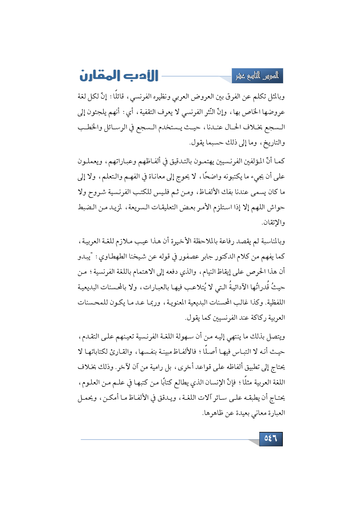 وبالمثل تكلم عن الفرق بين العروض العربي ونظيره الفرنسي، قائلًا: إنّ لكل لغة عروضها الخاص بها، وإنّ النّثر الفرنسي لا يعرف التقفية، أي: أنهم يلجئون إلى السجع بخلاف الحال عندنا، حيث يستخدم السجع في الرسائل والخطب والتاريخ، وما إلى ذلك حسبما يقول.