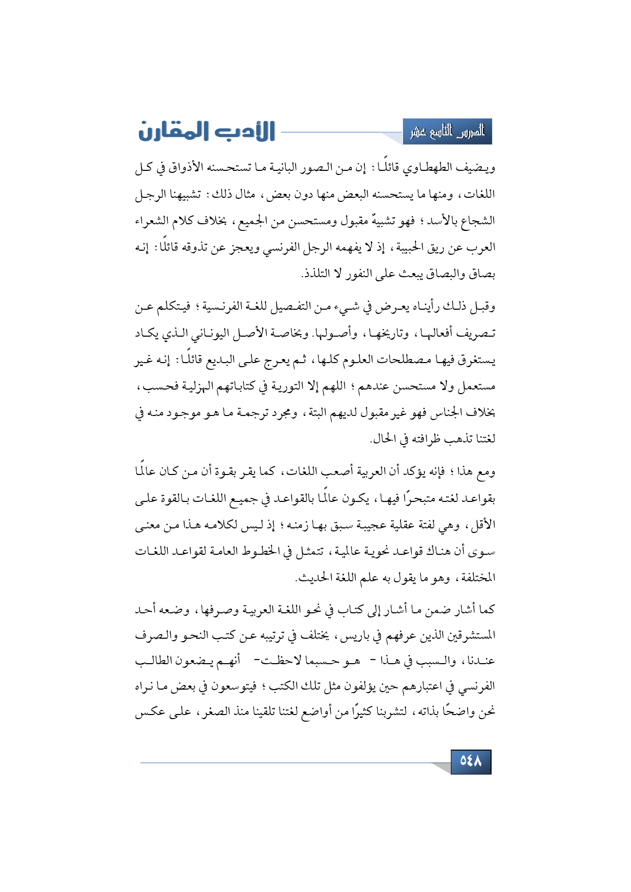 كما أشار ضمن ما أشار إلى كتاب في نحو اللغة العربية وصرفها، وضعه أحد المستشرقين الذين عرفهم في باريس، يختلف في ترتيبه عن كتب النحو والصرف عندنا، والسبب في هذا -هو حسبما لاحظت- أنهم يضعون الطالب الفرنسي في اعتبارهم حين يؤلفون مثل تلك الكتب؛ فيتوسعون في بعض ما نراه نحن واضحًا بذاته، لتشربنا كثيرًا من أواضع لغتنا تلقينا منذ الصغر، على عكس