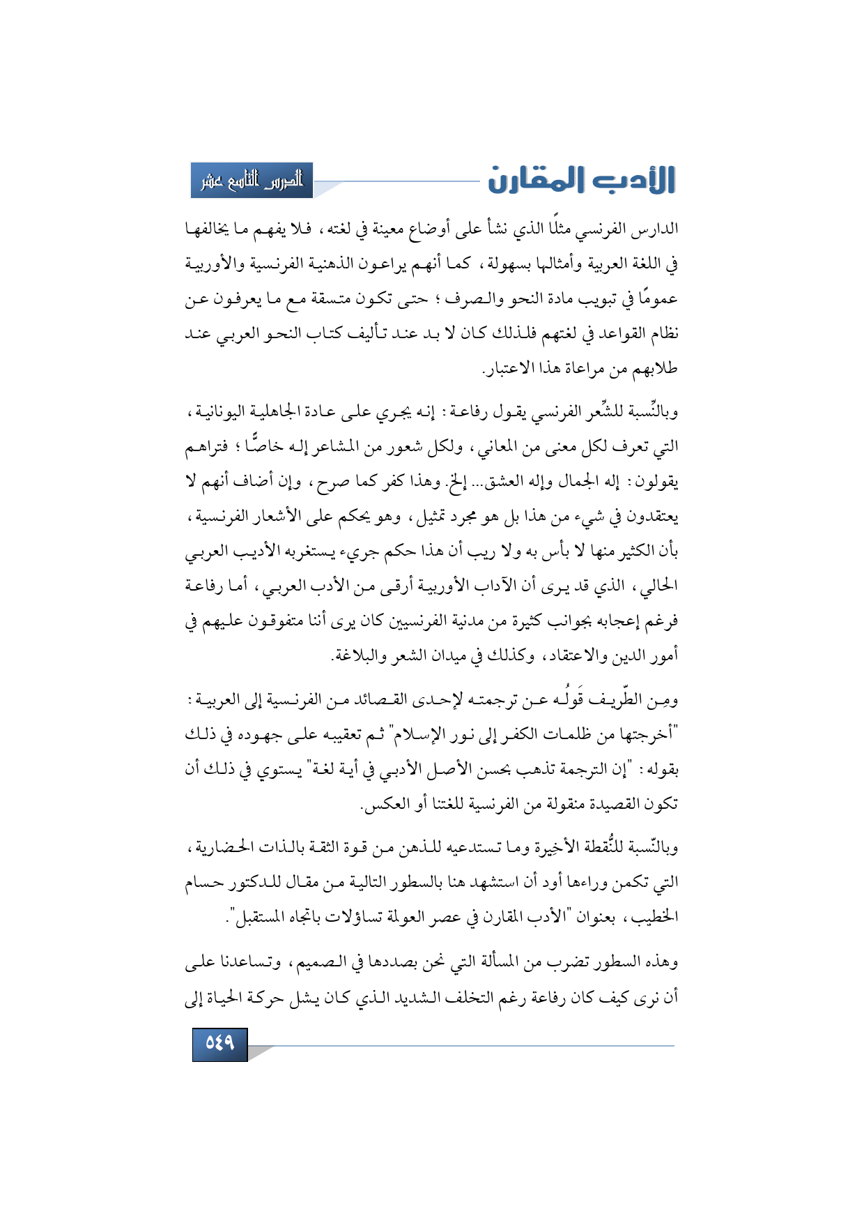 وبالنّسبة للنُّقطة الأخِيرة وما تستدعيه للذهن من قوة الثقة بالذات الحضارية، التي تكمن وراءها أود أن استشهد هنا بالسطور التالية من مقال للدكتور حسام الخطيب، بعنوان "الأدب المقارن في عصر العولمة تساؤلات باتجاه المستقبل".