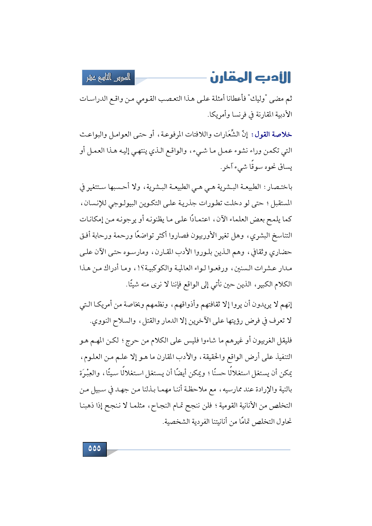 فليقل الغربيون أو غيرهم ما شاءوا فليس على الكلام من حرج؛ لكن المهم هو التنفيذ على أرض الواقع والحقيقة، والأدب المقارن ما هو إلا علم من العلوم، يمكن أن يستغل استغلالًا حسنًا؛ ويمكن أيضًا أن يستغل استغلالًا سيئًا، والعِبْرَة بالنية والإرادة عند ممارسيه، مع ملاحظة أننا مهما بذلنا من جهد في سبيل من التخلص من الأنانية القومية؛ فلن ننجح تمام النجاح، مثلما لا ننجح إذا ذهبنا نحاول التخلص تمامًا من أنانيتنا الفردية الشخصية.