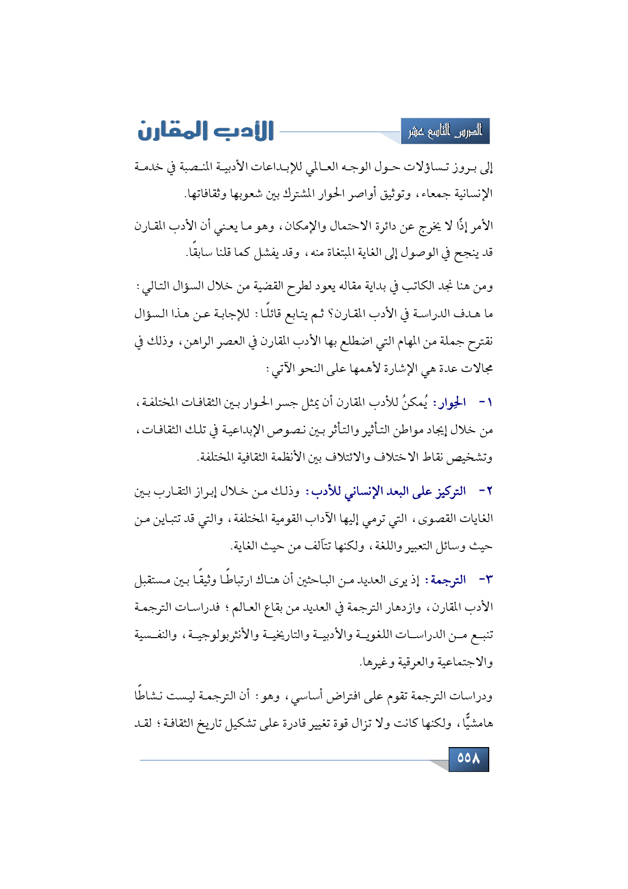1 - الحِوار: يُمكنُ للأدب المقارن أن يمثل جسر الحوار بين الثقافات المختلفة، من خلال إيجاد مواطن التأثير والتأثر بين نصوص الإبداعية في تلك الثقافات، وتشخيص نقاط الاختلاف والائتلاف بين الأنظمة الثقافية المختلفة.