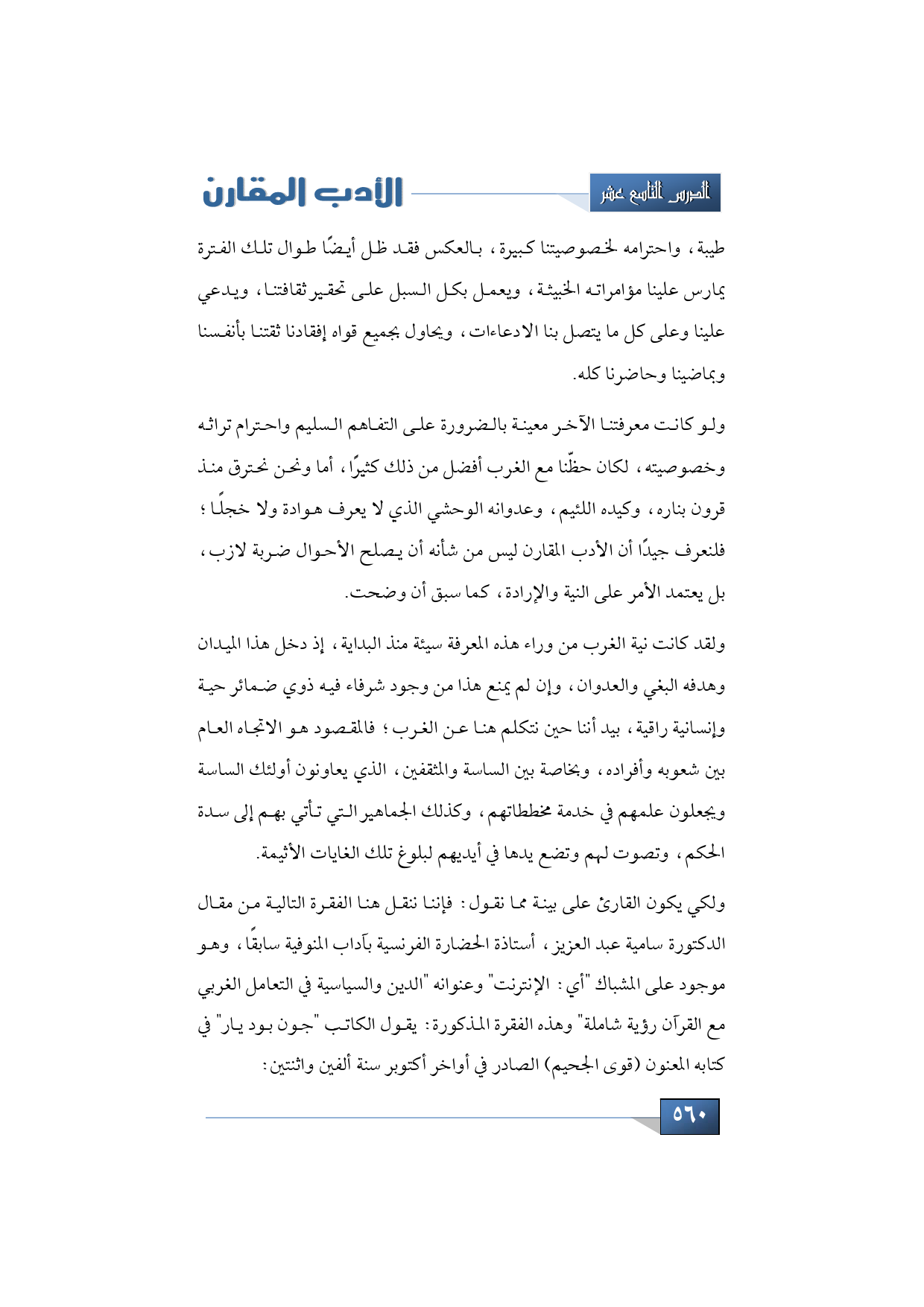 ولو كانت معرفتنا الآخر معينة بالضرورة على التفاهم السليم واحترام تراثه وخصوصيته، لكان حظّنا مع الغرب أفضل من ذلك كثيرًا، أما ونحن نحترق منذ قرون بناره، وكيده اللئيم، وعدوانه الوحشي الذي لا يعرف هوادة ولا خجلًا؛ فلنعرف جيدًا أن الأدب المقارن ليس من شأنه أن يصلح الأحوال ضربة لازب، بل يعتمد الأمر على النية والإرادة، كما سبق أن وضحت.