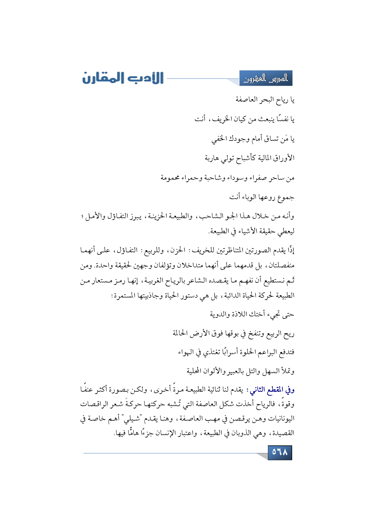 إذًا يقدم الصورتين المتناظرتين للخريف: الحزن، وللربيع: التفاؤل، على أنهما منفصلتان، بل قدمهما على أنهما متداخلان وتؤلفان وجهين لحقيقة واحدة. ومن ثَم نستطيع أن نفهم ما يقصده الشاعر بالرياح الغربية، إنها رمز مستعار من الطبيعة لحركة الحياة الدائبة، بل هي دستور الحياة وجاذبيتها المستمرة:
