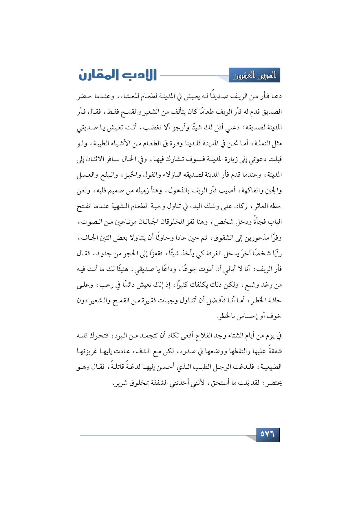 دعا فأر من الريف صديقًا له يعيش في المدينة لطعام للعشاء، وعندما حضر الصديق قدم له فأر الريف طعامًا كان يتألف من الشعير والقمح فقط، فقال فأر المدينة لصديقه: دعني أقل لك شيئًا وأرجو ألا تغضب، أنت تعيش يا صديقي مثل النملة، أما نحن في المدينة فلدينا وفرة في الطعام من الأشياء الطيبة، ولو قبِلت دعوتي إلى زيارة المدينة فسوف تشارك فيها، وفي الحال سافر الاثنان إلى المدينة، وعندما قدم فأر المدينة لصديقه البازلاء والفول والخبز، والبلح والعسل والجبن والفاكهة، أصيب فأر الريف بالذهول، وهنأ زميله من صميم قلبه، ولعن حظه العاثر، وكان على وشك البدء في تناول وجبة الطعام الشهية عندما انفتح الباب فجأةً ودخل شخص، وهنا قفز المخلوقان الجبانان مرتاعين من الصوت، وفرَّا مذعورين إلى الشقوق، ثم حين عادا وحاولَا أن يتناولا بعض التين الجاف، رأيَا شخصًا آخرَ يدخل الغرفة كي يأخذ شيئًا، فقفزَا إلى الحجر من جديد، فقال فأر الريف: أنا لا أبالي أن أموت جوعًا، وداعًا يا صديقي، هنيئًا لك ما أنت فيه من رغد وشبع، ولكن ذلك يكلفك كثيرًا، إذ إنك تعيش دائمًا في رعب، وعلى حافة الخطر، أما أنا فأفضل أن أتناول وجبات فقيرة من القمح والشعير دون خوف أو إحساس بالخطر.